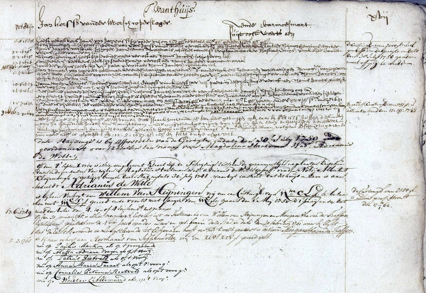 is bij Jannetgen Ghijsbertsdr wedue van Cors Jansz van de Morsch vercost aen h[ee]r Jan Pietersz Veeckens lintier Sijmon Henricxs backer Thonis Jacobsz van Wijck schipper Jan Eleman apothecaris Michiel Cornelisz Vrijtlandt backer Bastiaen Dircxs Vinck ende Davidt Ursijns hoedecramer om etc[etra] Sijmon Henricxs heeft sijn sevende paert vercost aen Thonis Jacobsz Schipper om etc[etra] Jan Pietersz Veeckens heeft sijn sevende paert vercost aen Thonis Jacobsz voornomt om etc[etra] David des Ursijns heeft sijn VIJ paert vercost aen Thonis Jacobsz voorn[oem]t etc[etra] …. | de custingb[rief] van 2000 g[u]l[den] is vol gens hijp[otheek] van de geregte in dato den 30e julijk z170 geordeer neert aff gel[o]s[t] te werdden |