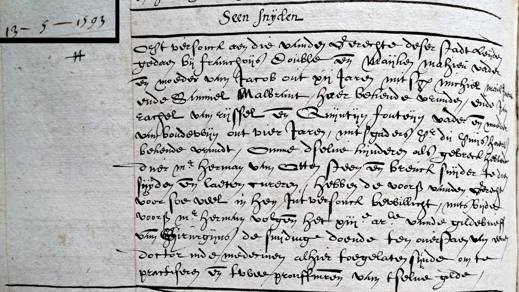 steensnijden opt versouck aen die van den gerechte deser stadt Leijden gedaen bij Franchouijs Double en[de] Maijken Mahieu vader en[de] moeder van Jacob out XIJ jaren mitsgaders Michiel Mailjaert ende Samuel Malbrant haer bekende vrinden ende jan Rachel van Rijssel en[de] Quijntijn Fonteijn vader en moeder van Boudeweijn out vier jaren mitsgaders P[iete]r du Puijs haerl[ieder] bekende vrindt omme d[e] selve kijnderen als gebreck hebbende duer m[eeste]r Herman van Otten steen en[de] breuck snijder te doen