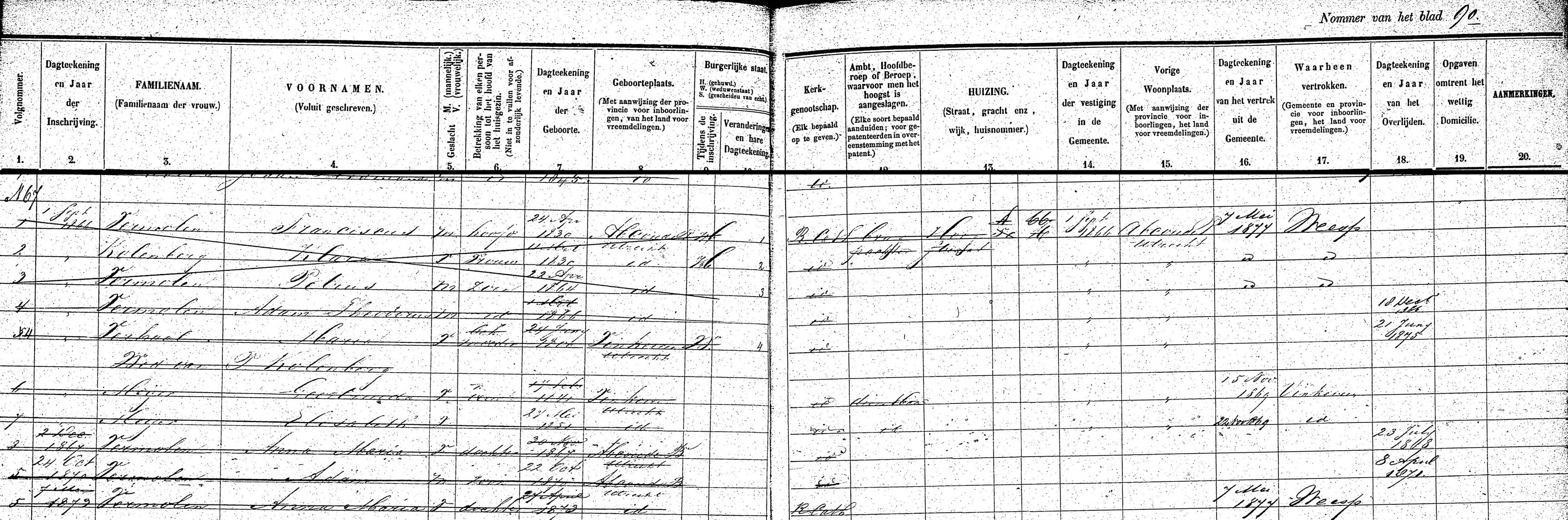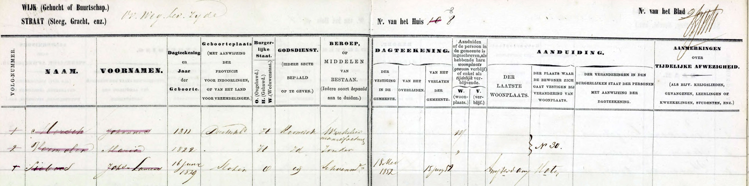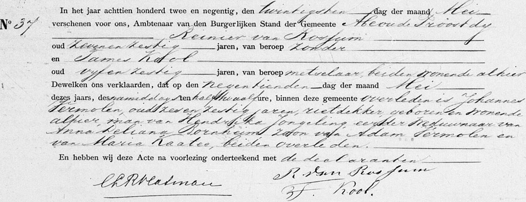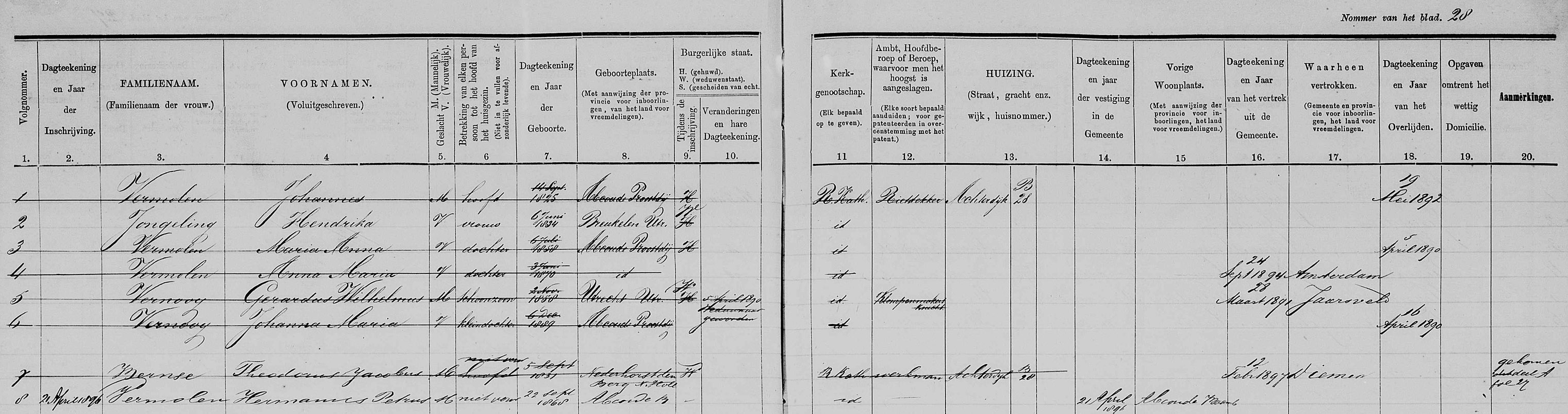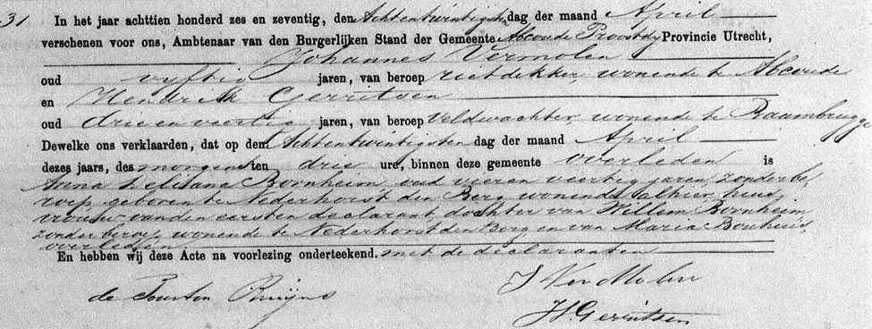 | 5. | m | Johannes (Jan) VERMOOLEN [1018], rietdekker. Geb. op 14-09-1824 te Abcoude-Proostdij (bron: BS Abcoude-Proostdij). Overl. op 19-05-1892 te Abcoude-Proostdij op 67-jarige leeftijd (bron: BS Abcoude-Proostdij). Otr. (1) [336] op 06-04-1855 te Nederhorst den Berg (bron: BS Nederhorst den Berg). Echtgenote is Anna Deliana (Anna Deliana) BORNHEIM (Bernheim) [1026], 22 jaar oud, naaister. Geb. op 13-03-1833 te Nederhorst den Berg (bron: BS Nederhorstdenberg). Overl. op 28-04-1876 te Abcoude-Proostdij op 43-jarige leeftijd (bron: BS Abcoude Proostdij). Dr. van Willem (Willem) BERNHEIM [1028] en Maria (Maria) BOUHUIS [1029]. Woonplaatsen na verlaten ouderlijkhuis te _: - Op __-__-18__ Abcoude Proostdij - 28c (bron: bevolkingsregister Abcoude Proostdij 1849-1859 inv nr 585) - Op 31-12-1859 Abcoude Proostdij - Kerkbuurt 42 (bron: bevolkingsregister Abcoude Proostdij 1859-1879 inv nr 587) - Op 31-12-1859 Abcoude Proostdij - (bron: bevolkingsregister Abcoude Proostdij 1859-1879 inv nr 587) - Op __-05-1867 Abcoude Proostdij - Achterdijk 25b (bron: bevolkingsregister Abcoude Proostdij 1859-1879 inv nr 587) Otr. (2) [335] op 31-01-1879 te Breukelen Nijenrode (bron: BS Breukelen Nijenrode). Echtgenote is Hendrika (Hendrika) JONGELING [1019], 44 jaar oud. Geb. op 21-06-1834 te Breukelen Nijenrode (bron: BS Breukelen Nijenrode). Overl. op 13-02-1907 te Abcoude-Proostdij op 72-jarige leeftijd (bron: BS Abcoude-Proostdij). Dr. van Adrianus (Adrianus) JONGELING [1020] en Magdalena (Magdalena) van SCHAIK [1025]. Woonplaatsen na hun huwelijk: - Op 21-03-1879 Abcoude Proostdij - Achterdijk B25, B28, B40, (bron: bevolkingsregister Abcoude Proostdij 1859-1879 inv nr 587 + 1890-1899 inv nr 591 + 1890-1899 inv nr 594) |