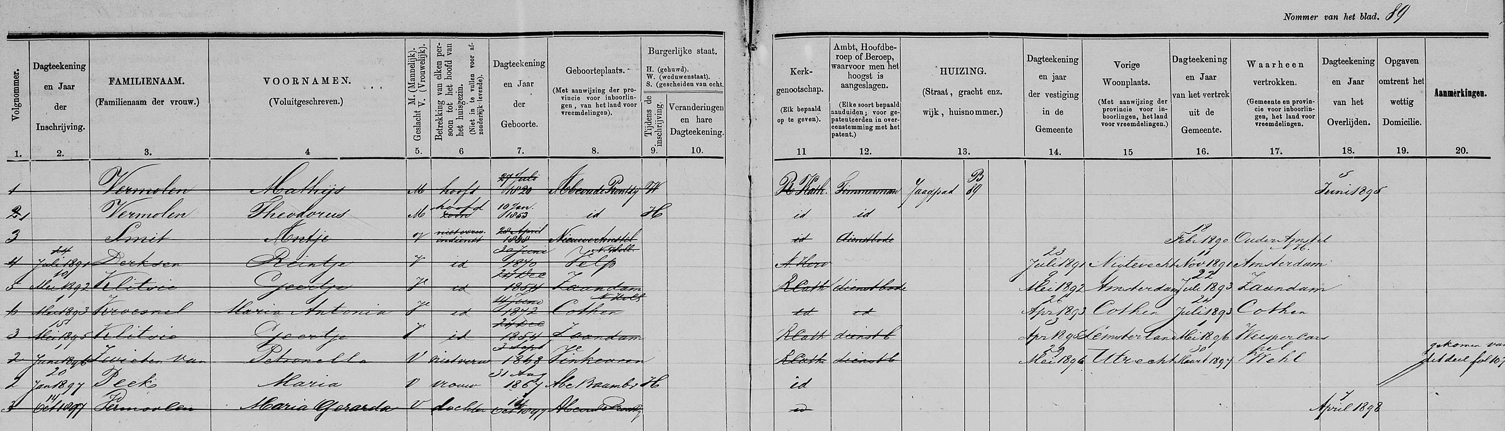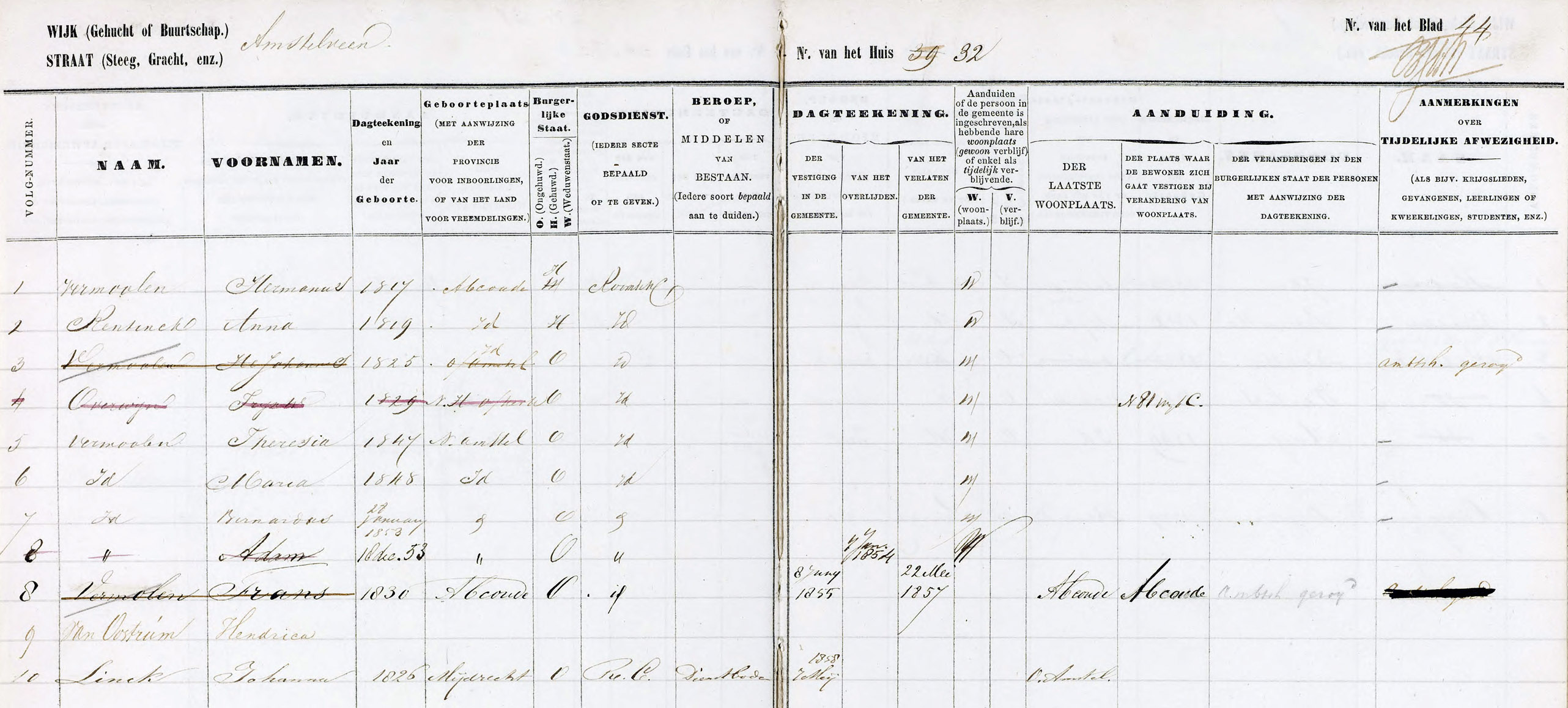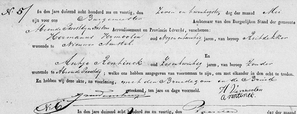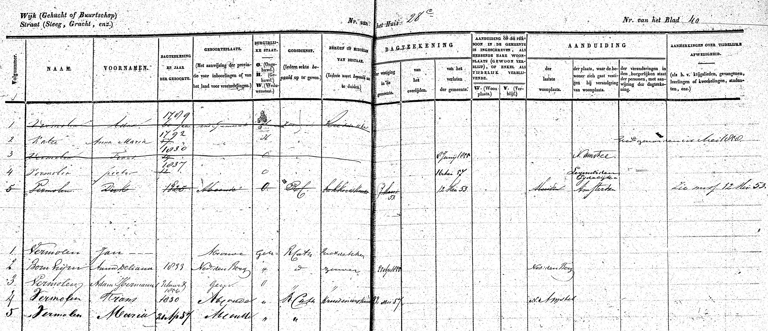 | 1. | m | Hermanus (Hermanus) VERMOOLEN [445], winkelier. Geb. op 25-03-1817 te Abcoude Baambrugge (bron: BS Abcoude Baambrugge). Overl. op 23-01-1883 te Nieuwer Amstel op 65-jarige leeftijd (bron: BS Nieuwer Amstel). Otr. [119] op 27-05-1846 te Abcoude-Proostdij (bron: BS Abcoude-Proostdij). Echtgenote is Antje (Antje) RENTINK [448], 26 jaar oud. Geb. op 13-10-1819 te Abcoude Baambrugge (bron: BS Abcoude). Overl. op 10-09-1896 te Nieuwer-Amstel op 76-jarige leeftijd (bron: BS Nieuwer-Amstel). Dr. van Bernardus (Bernardus) RENTINK [449] en Teresia (Teresia) de BOER [450]. Woonplaatsen na vertrek ouderlijkhuis te _: - Op 31-12-1859 Nieuwer Amstel - A39, A32, 66 (bron: bevolkingsregister Nieuwer Amstel 1850-1860 inv nr 1 + 1860-1870 inv nr 31 + 1869-1876 inv nr 39 + 1876-1880 inv nr 69) |