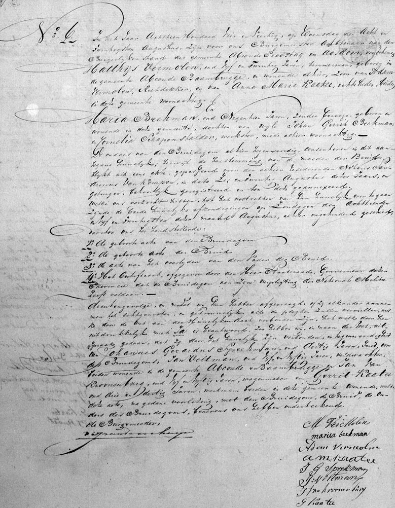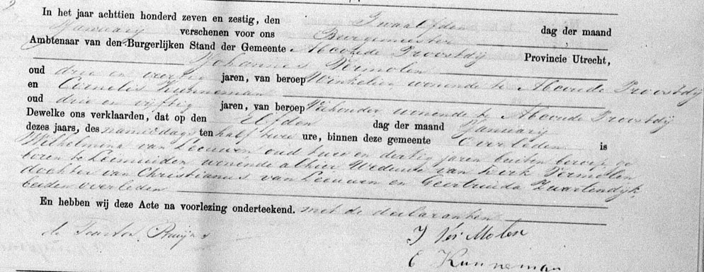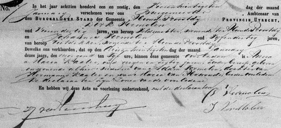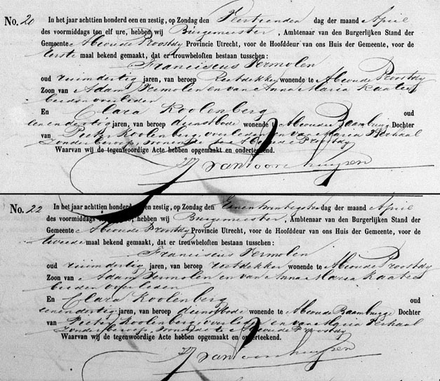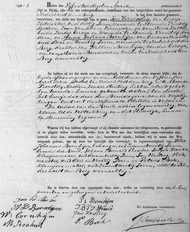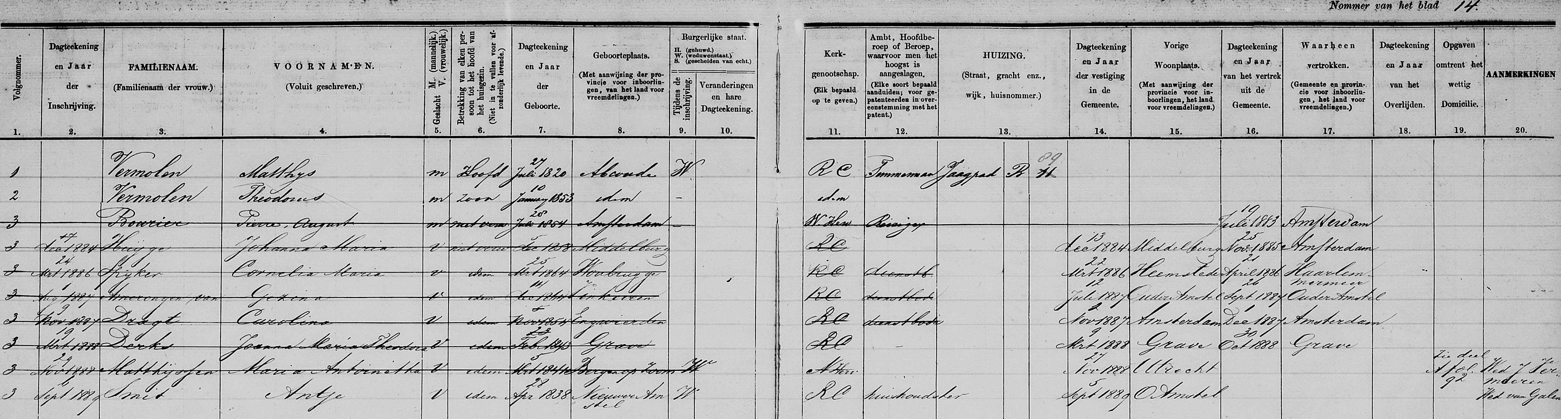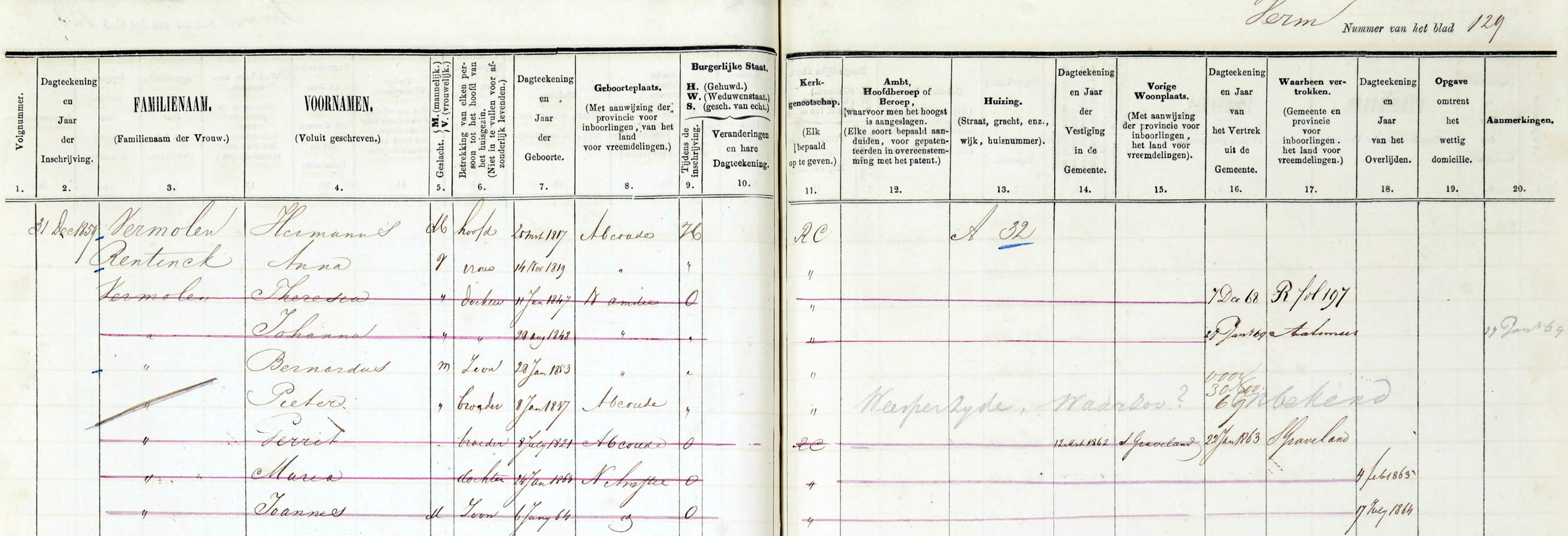 | 1. | m | Hermanus (Hermanus) VERMOOLEN [445], winkelier. Geb. op 25-03-1817 te Abcoude Baambrugge (bron: BS Abcoude Baambrugge). Overl. op 23-01-1883 te Nieuwer Amstel op 65-jarige leeftijd (bron: BS Nieuwer Amstel). Otr. [119] op 27-05-1846 te Abcoude-Proostdij (bron: BS Abcoude-Proostdij). Echtgenote is Antje (Antje) RENTINK [448], 26 jaar oud. Geb. op 13-10-1819 te Abcoude Baambrugge (bron: BS Abcoude). Overl. op 10-09-1896 te Nieuwer-Amstel op 76-jarige leeftijd (bron: BS Nieuwer-Amstel). Dr. van Bernardus (Bernardus) RENTINK [449] en Teresia (Teresia) de BOER [450]. Woonplaatsen na vertrek ouderlijkhuis te _: - Op 31-12-1859 Nieuwer Amstel - A39, A32, 66 (bron: bevolkingsregister Nieuwer Amstel 1850-1860 inv nr 1 + 1860-1870 inv nr 31 + 1869-1876 inv nr 39 + 1876-1880 inv nr 69) |