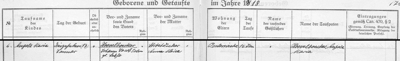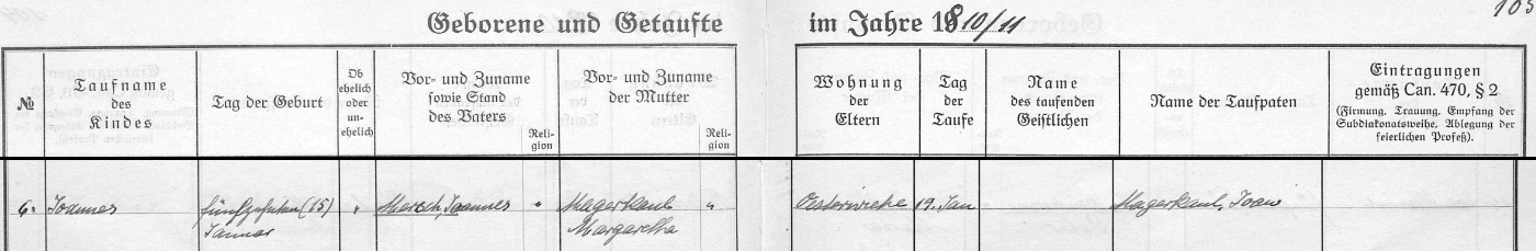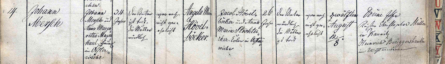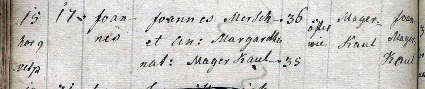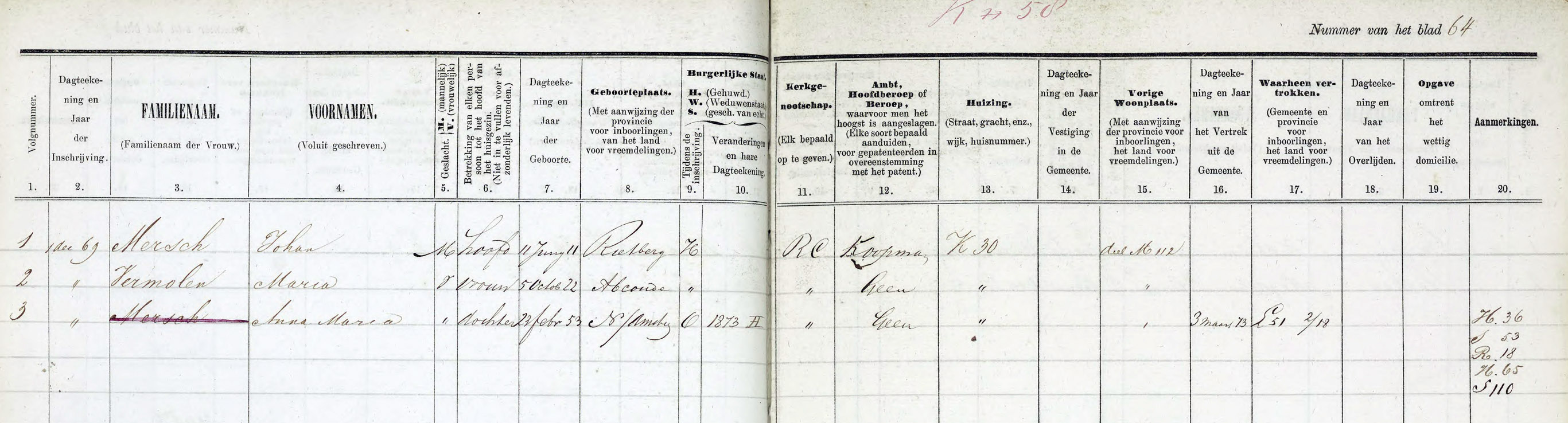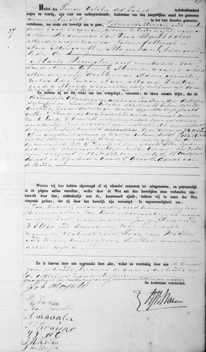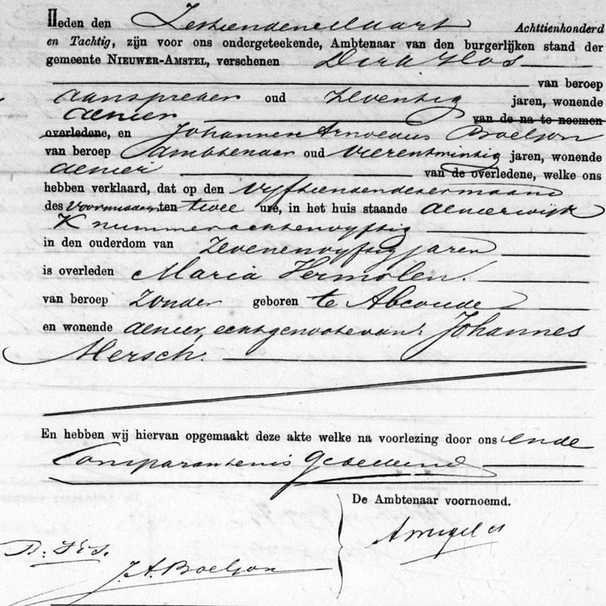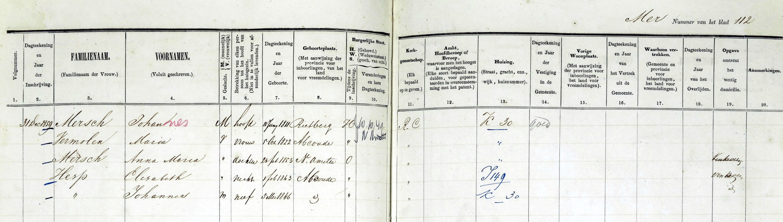 | 4. | v | Maria (Maria) VERMOOLEN [7520]. Geb. op 05-10-1822 te Abcoude Baambrugge (bron: BS Abcoude Baambrugge). Overl. op 15-03-1880 te Nieuwer Amstel op 57-jarige leeftijd (bron: BS Nieuwer Amstel). Otr. [2761] op 28-09-1849 te Nieuwer Amstel (bron: BS Nieuwer Amstel). Echtgenoot is Johannes (Johannes) MERSCH [8501], 38 jaar oud, koopman. Geb. op 15-01-1811 te Osterwiehe (DE) (bron: DTB Kaunitz inv nr KB001-01-T + KB001b-01-zt). Overl. op 07-06-1883 te Nieuweramstel op 72-jarige leeftijd (bron: BS Nieuweramstel). Zn. van Johannes (Johannes) MERSCH [8502] en Anna Margaretha (Anna Margaretha) MAGERKAUL [8503]. Johannes Mersch was weduwnaar: Otr. [3451] ? te ? Tr. 08-1845 (bron: ?), tr. kerk op 12-08-1845 te Kaunitz (RK) (bron: DTB Kaunitz inv nr KB006-01-H). Geb. op 13-01-1818 te Osterwiehe (DE) (bron: DTB Kaunitz inv nr KB001-01-t + KB001-01b-zt). Overl. op 12-04-1849 te Nieuwer Amstel op 31-jarige leeftijd (bron: BS Nieuwer Amstel). Dr. van Jacobus (Jacobus) HOVELBÖKER [10801] en Anna Maria (Anna Maria) STROETDIECKER [10802]. Woonplaatsen na vertrek ouderlijkhuis te _: - Op 31-12-1859 Nieuwer Amstel - K8, K30 (bron: bevolkingsregister Nieuwer Amstel 1850-1860 inv nr 10 + 1860-1870 inv nr 24 + 1869-1876 inv nr 58) |