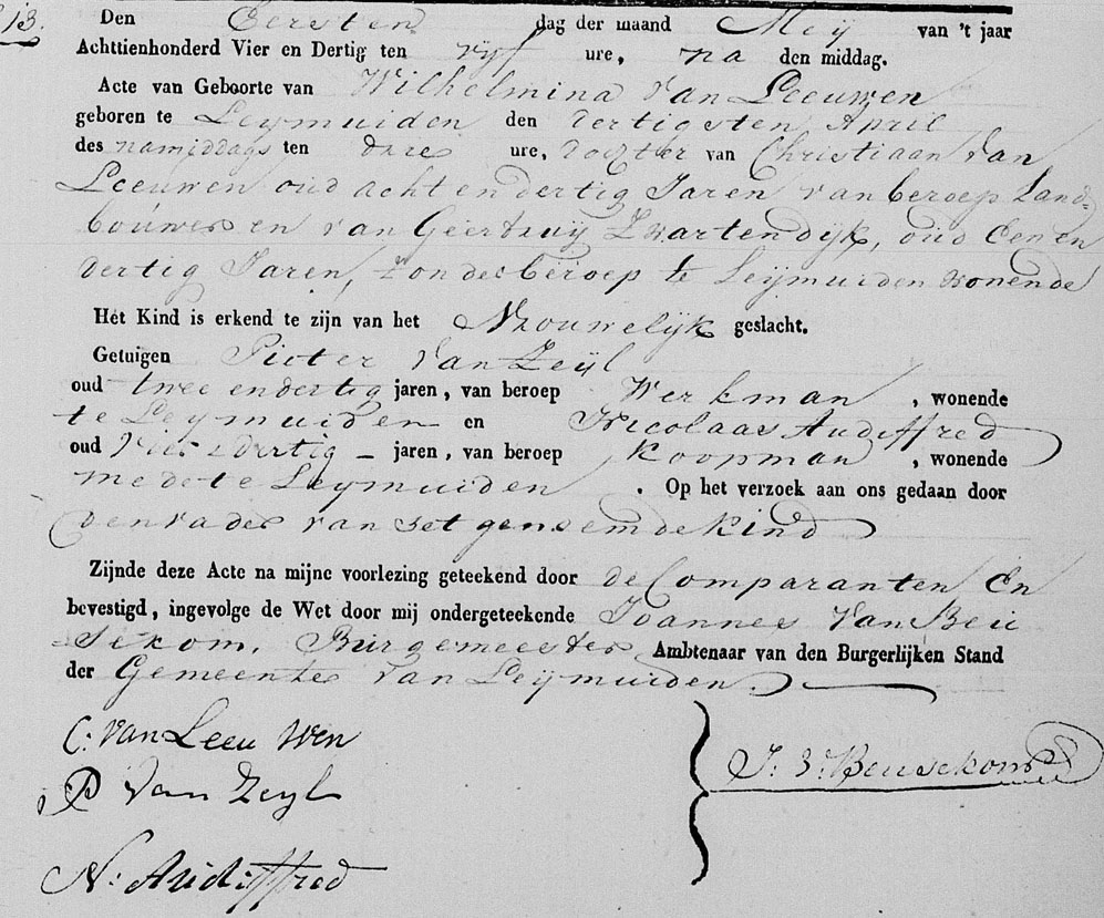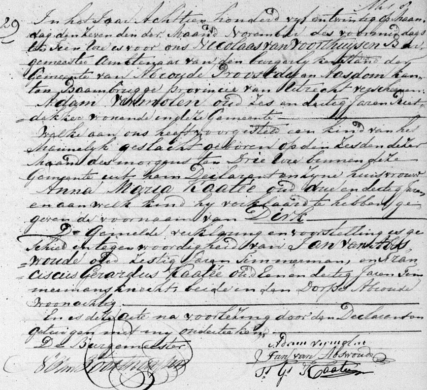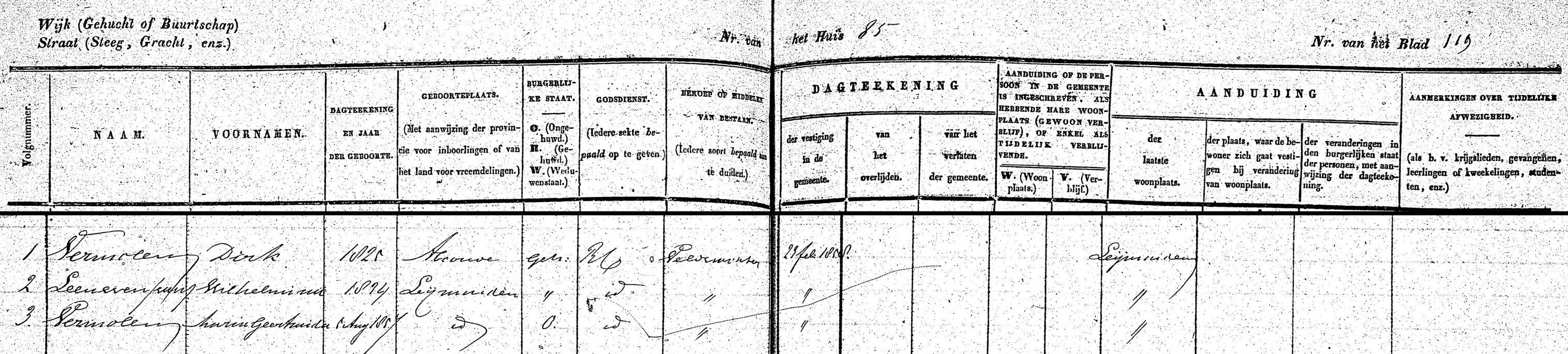 | 6. | m | Dirk (Dirk) VERMOOLEN [7495], veldwachter. Geb. op 06-11-1825 te Abcoude-Proostdij (bron: BS Abcoude-Proostdij). Overl. op 25-07-1866 te Abcoude-Proostdij op 40-jarige leeftijd (bron: BS Abcoude-Proostdij). Otr. [2468] ? te ? Tr. op 28-jarige leeftijd op 13-07-1854 te Leimuiden (bron: BS Leimuiden). Echtgenote is Wilhelmina (Wilhelmina) van LEEUWEN [7496], 20 jaar oud. Geb. op 30-04-1834 te Leimuiden (bron: BS Leimuiden). Overl. op 11-01-1867 te Abcoude-Proostdij op 32-jarige leeftijd (bron: BS Abcoude-Proostdij). Dr. van Christianus (Christianus) van LEEUWEN [7497] en Geertruida (Geertruida) ZWARTENDIJK [7498]. Woonplaatsen na zijn verlaten van het ouderlijkhuis te _: - Op 12-05-1853 Amsterdam - (bron: ?) Woonplaatsen na hun huwelijk: - Op __-__-____ Amsterdam - Op __-12-1855 Nieuwer Amstel - 50, 42 (bron: bevolkingsregister Nieuwer Amstel 1850-1860 inv nr 1) - Op __-__-____ Leimuiden - - Op __-__-18__ Abcoude Proostdij - 85 (bron: bevolkingsregister Abcoude Proostdij 1849-1859 inv nr 585) - Op 31-12-1859 Abcoude Proostdij - Dorpstraat 51a (bron: bevolkingsregister Abcoude Proostdij 1859-1879 inv nr 587) - Op 31-12-1859 Abcoude Proostdij - Achterdijk (bron: bevolkingsregister Abcoude Proostdij 1859-1879 inv nr 587) |