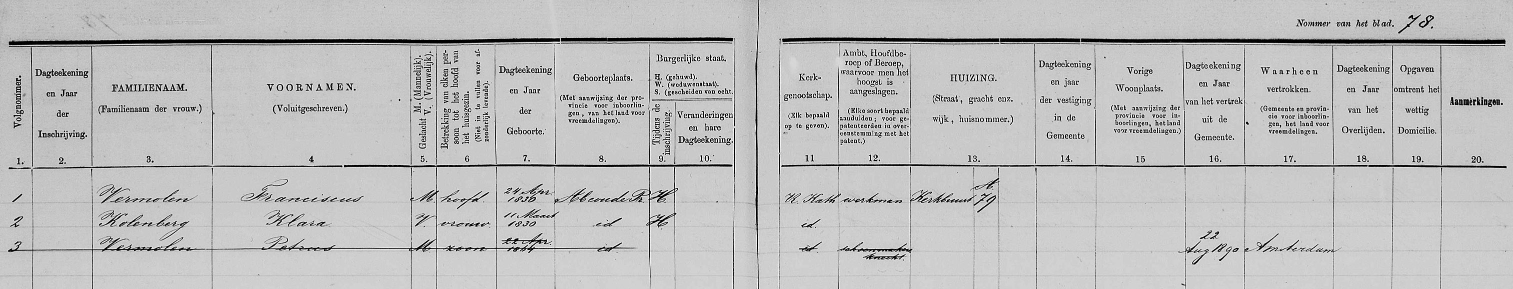| 8. | m | Johannes Fransiscus (Fransiscus) VERMOOLEN [447], rietdekker. Geb. op 23-04-1830 te Abcoude-Proostdij (bron: BS Abcoude-Proostdij). Overl. op 01-04-1910 te Abcoude-Proostdij op 79-jarige leeftijd (bron: BS Abcoude-Proostdij). Otr. [121] op 13-04-1861 te Abcoude-Proostdij (bron: BS Abcoude-Proostdij). Echtgenote is Clara (Clara) KOOLENBERG [454], 31 jaar oud. Geb. op 15-03-1830 te Abcoude-Proostdij (bron: DTB Abcoude-Proostdij). Overl. ? te ? Begr. ? te ? Dr. van Pieter (Pieter) KOOLENBERG [455] en Maria (Maria) VERHAAL [456]. Woonplaatsen na zijn verlaten van het ouderlijkhuis te _: - Op 08-06-1855 Nieuwe Amstel - Woonplaatsen na hun huwelijk: - Op __-__-18__ Abcoude Proostdij - Op 01-09-1866 Abcoude Baambrugge - 50, 66 (bron: bevolkingsregister Abcoude Baambrugge 1859-1879 inv nr 559) - Op 07-05-1877 Weesp (bron: ?) - Op 27-09-1877 Abcoude Proostdij - Achterdijk 25 (bron: bevolkingsregister Abcoude Proostdij 1859-1879 inv nr 587) - Op 16-12-1878 Abcoude Baambrugge - 14 (bron: bevolkingsregister Abcoude Baambrugge 1859-1879 inv nr 559) - Op 01-01-1880 Abcoude Baambrugge - stationsweg A13 (bron: bevolkingsregister Abcoude Baambrugge 1880-1889 inv nr 562) - Op 26-03-1885 Abcoude Proostdij - Kerkbuurt B73, B79 (bron: bevolkingsregister Abcoude Proostdij 1880-1889 inv nr 590 + 1890-1899 inv nr 593) |