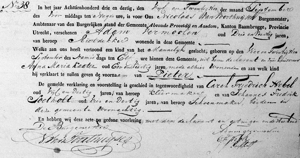 | 10. | m | Pieter (Pieter) VERMOOLEN [7521]. Geb. op 24-09-1833 te Abcoude-Proostdij (bron: BS Abcoude-Proostdij). Overl. op 12-07-1834 te Abcoude-Proostdij, 291 dagen oud (bron: BS Abcoude-Proostdij). Pieter heet Franciscus bij overlijden ? |