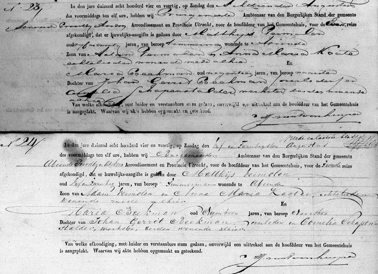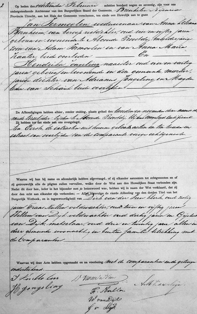 | 2. | m | Matthijs (Matthijs) VERMOOLEN [446], timmerman. Geb. op 27-07-1819 te Abcoude Baambrugge (bron: BS Abcoude Baambrugge). Overl. op 05-06-1895 te Abcoude-Proostdij op 75-jarige leeftijd (bron: BS Abcoude-Proostdij). Otr. [120] op 16-08-1844 te Abcoude-Proostdij (bron: BS Abcoude-Proostdij). Echtgenote is Maria (Maria) BEEKMAN [451], 19 jaar oud. Geb. op 20-10-1824 te Abcoude-Proostdij (bron: BS Abcoude-Proostdij). Overl. op 25-08-1863 te Abcoude-Proostdij op 38-jarige leeftijd (bron: BS Abcoude-Proostdij). Dr. van Johan Gerrit (Johan Gerrit) BEEKMAN [452] en Cornelia (Cornelia) SCHAPENSTALDER [453]. Woonplaatsen na verlaten ouderlijkhuis te _: - Op __-__-18__ Abcoude Baambrugge - 26 (bron: bevolkingsregister Abcoude Baambrugge 1849-1859 inv nr 557) - Op __-__-1850 Abcoude Proostdij - Op 31-12-1889 Abcoude Proostdij - 60, B2 (bron: bevolkingsregister Abcoude Proostdij 1859-1879 inv nr 587) - Op __-__-18__ Abcoude Proostdij - Jaagpad B89 (bron: bevolkingsregister Abcoude Proostdij 1880-1989 inv nr 591 + 1890-1999 inv nr 594) |
