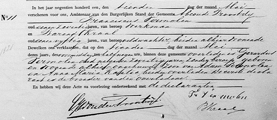 | 11. | m | Petrus (Petrus) VERMOOLEN (Vermolen) [420] (code: 2^05+12), geb. op 08-01-1837 te Abcoude-Proostdij (zie 44). |