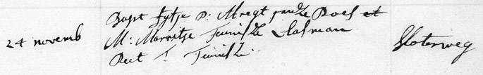 6. | m | Nicolaas (Nicolaas) Johannesz HOMBERGEN [14596]. Geb. op 15-02-1734 te Cuijk (bron: ?), ged. ? te ? Overl. ? te ? Begr. ? te ? Otr. [4593] ? te ? Tr. ? te ? Tr. kerk ? te ? Echtgenote is Adriana (Adriana) KERCKHOF [14598]. Geb. ? te ? Ged. ? te ? Overl. ? te ? Begr. ? te ? Dr. van ? (?) KERCKHOF [14599] en ? (?) ? [14600]. |