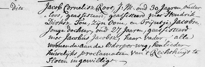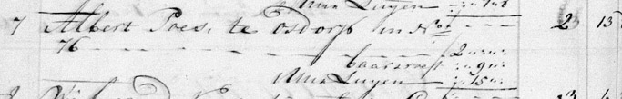 11. | m | Jan (Jan) Albertsz POES [24102]. Geb. ±02-1759 te Sloterweg (bron: ?), ged. (RK) op 28-02-1759 te Sloten (get.: Leuntje Teunis Vlasman) (bron: DTB Sloten inv nr 2). ![]() |
