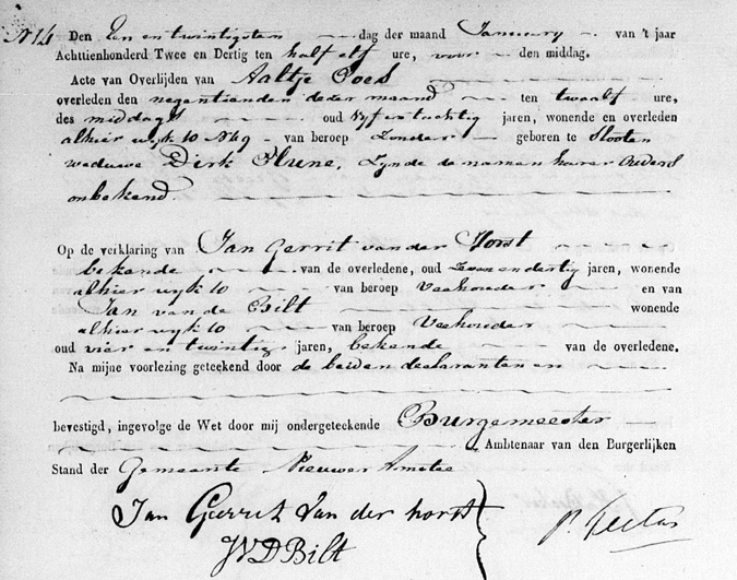 6. | v | Aaltje (Aaltje) Alberts POES [24105]. Geb. ±12-1748 te Sloterweg (bron: ?), ged. (RK) op 25-12-1748 te Sloten (get.: Aaltje Willems) (bron: DTB Sloten inv nr 1). ![]() Overl. op 19-01-1832 te Nieuwer Amstel (bron: BS Nieuwer Amstel). ![]() Otr. [7681] ? te ? Tr. op 09-02-1777 te Nieuwer Amstel (bron: DTB Nieuwer Amstel inv nr 27). ![]() Echtgenoot is Dirk (Dirk) Gerritsz PLEUN [25551]. Geb. ±12-1744 te verm. Vinkeveen (bron: ?), ged. (RK) op 12-12-1744 te Vinkeveen (get.: Trijntje van Veen) (bron: ?). Overl. op 04-08-1825 te Nieuwer Amstel (bron: BS Nieuwer Amstel). ![]() Zn. van Gerrit (Gerrit) Jansz PLEUN [25552] en Dirkje (Dirkje) Jans van de GEUSESLOOT [25553]. |