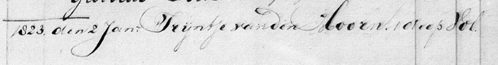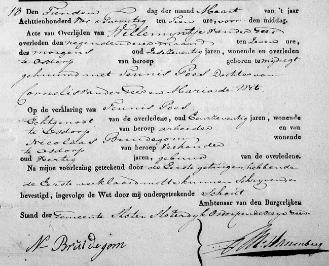 12. | m | Jacob (Jacob) Albertsz POES [5590], tapper, kastelein. Geb. ±09-1761 te Sloten (bron: ?), ged. (RK) op 04-09-1761 te Sloten (get.: Marritje Teunis Vlasman en Marritje Huijbregts) (bron: DTB Sloten inv nr 2). ![]() Overl. op 29-12-1824 te Sloten (aang.: Gosewijn van Haren (36) veehouder te Sloten neef en Teunis van den Hooren (60) viskoper te Sloten zwager van de overledene) (bron: BS Sloten), begr. op 31-12-1824 te Sloten (bron: DTB Sloten inv nr 538). ![]() ![]() Echtgenote is Trijntje (Trijntje) Jans van den HOORN (van den Hooren) [5591]. Geb. ±08-1757 te Sloten (bron: ?), ged. (RK) op 25-08-1757 te Sloten (get.: Teeuwis Jacobsz en Rutje Crelis) (bron: DTB Sloten inv nr 2). ![]() Overl. op 27-12-1822 te Sloten (bron: BS Sloten), begr. op 02-01-1822 te Sloten (bron: DTB Sloten inv nr 538), graf nr 139 ![]() ![]() Dr. van Jan (Jan) Pietersz van den HOORN (van den Hooren) [5592] en Hendrikje (Hendrikje) Cornelis WESTEVELDT [5593]. |