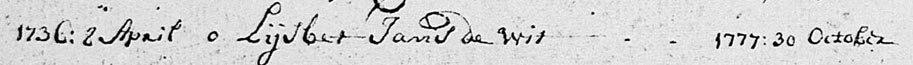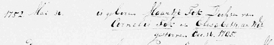 6. | v | Grietje (Grietje) Cornelis FOK [3485]. Geb. ±1759 te Wieringen (bron: ?), ged. (Doopsgezind) op 04-04-1779 te Wieringen (bron: ?). Overl. op 07-01-1808 te Wieringen (bron: ?), begr. ? te ? Otr. [1278] ? te ? Tr. ±04-1785 te ? (bron: ?), tr. kerk op 16-04-1785 te Wieringen (Doopsgezind) (bron: ?). Echtgenoot is Pieter (Pieter) Jansz de HAAN [3486]. Geb. ±1757 te ? (bron: ?), ged. ? te ? Overl. op 14-11-1811 te Wieringen (bron: ?), begr. ? te ? Zn. van Jan (Jan) de HAAN [3487] en Antje (Antje) Simons KUUT [3488]. |
