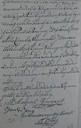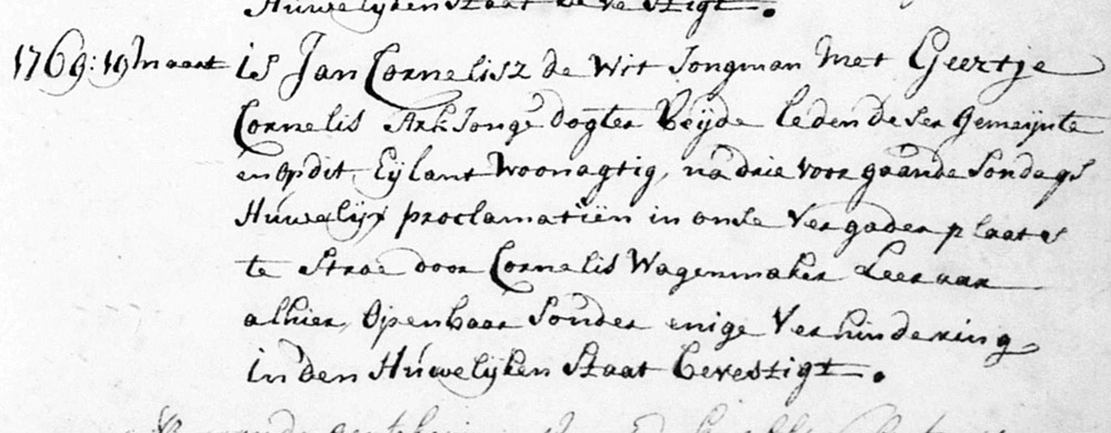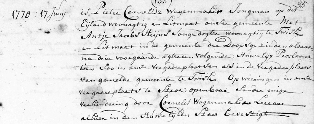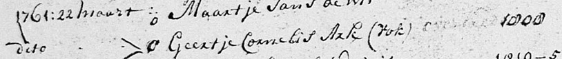 4. | v | Antje (Antje) Cornelis ARK [3481]. Geb. ±1755 te Wieringen (bron: ?), ged. (Doopsgezind) op 11-04-1773 te Wieringen (bron: ?). Overl. ? te ? Begr. ? te ? Otr. [1277] ? te ? Tr. op 21-09-1789 te Wieringen (bron: ?), tr. kerk ? te ? Echtgenoot is Simon (Simon) Cornelisz MAARS [3482], 37 jaar oud. Geb. op 04-05-1752 te Wieringen (bron: ?), ged. (Doopsgezind) op 04-10-1778 te Wieringen (bron: ?). Overl. ? te ? Begr. ? te ? Zn. van Cornelis (Cornelis) Cornelisz MAARS [3483] en Maartje (Maartje) Simons VET [3484]. |