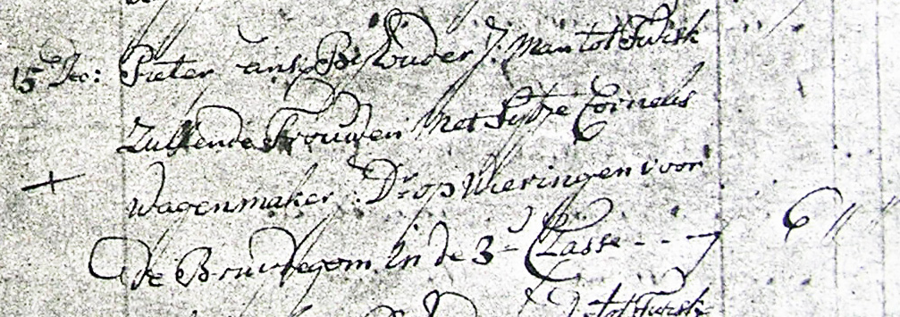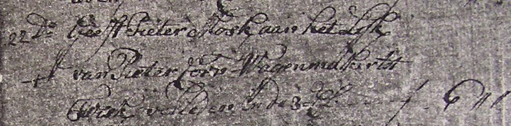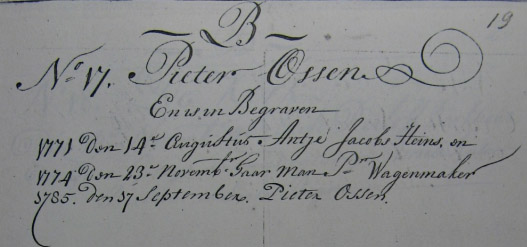 1. | m | Pieter (Pieter) Cornelisz WAGEMAKER [3492]. Geb. op 01-12-1745 te Wieringen (bron: ?), ged. (Doopsgezind) op 22-05-1763 te Wieringen (bron: DTB Wieringen inv nr 21). ![]() Overl. ±10-1774 te Twisk (aang.: Pieter Mosk / Pieter Oss) (bron: DTB Wieringen inv nr 21 + Abbekerk inv nr 9 + Twisk inv nr 11), aangifte 22-10-1774 Abbekerk ![]() aangifte 22-11-1774 Twisk ![]() volgens lidmaten boek Wieringen 18-12-1774 ![]() ![]() Otr. (1) [1280] op 26-05-1770 te Abbekerk (bron: DTB Abbekerk inv nr 8). ![]() ![]() Echtgenote is Antje (Antje) Jacobs HEIJN [3493]. Geb. ? te verm. Twisk (bron: ?), ged. ? te ? Overl. ±08-1771 te Wieringen (aang.: Pieter Ossen) (bron: DTB Abbekerk inv nr 9). Aangifte op 13-08-1771 ![]() ![]() Dr. van Jacob (Jacob) Jansz HEINS [3494] en Zoutje (Zoutje) Jans BLAUW [3495]. Otr. (2) [1281] op 17-12-1773 te Abbekerk (bron: DTB Abbekerk inv nr 8). ![]() ![]() Echtgenote is Maartje (Maartje) Pieters MOSK [3496]. Geb. ? te ? Ged. ? te ? Overl. op 08-09-1789 te Twisk (aang.: Pieter Mosk) (bron: DTB Abbekerk inv nr 9 Twisk inv nr 8). Aangifte 10-09-1789 ![]() ![]() Dr. van Pieter (Pieter) Cornelisz MOSK [3497] en Antje (Antje) Cornelis WOGNUM [3498]. Maartje Pieters MOSK hertrouwd: Otr.[1282] op 19-01-1778 te Abbekerk (bron: DTB Abbekerk inv nr 8) ![]() ![]() met Cornelis (Cornelis) Jansz BREGGER [3499] geb. op ? te ?, ged op ? te ?, overl. op ? te ?, begr. op ? te ?, zv: Jan (Jan) BREGGER [3500] en ? (?) ? [3501]. |