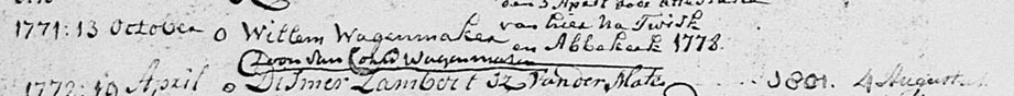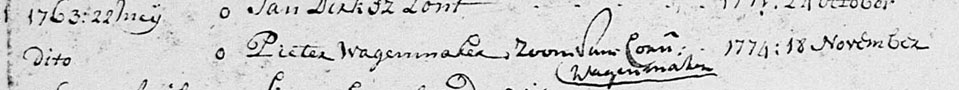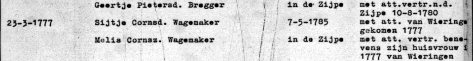 3. | m | Melis (Melis) Cornelisz WAGEMAKER [3503]. Geb. op 07-12-1748 te Wieringen (bron: ?), ged. op 19-04-1767 te Wieringen (bron: DTB Wieringen inv nr 21). ![]() ![]() - Op 10-08-1780 met attestatie vertrokken (bron: DTB Twisk inv nr 8) ![]() Otr. [1283] op 29-11-1775 te Abbekerk (bron: DTB Abbekerk inv nr 8). ![]() ![]() Echtgenote is Geertje (Geertje) Pieters BREGGER [3504]. Geb. ±1757 te Twisk (bron: ?), ged. (Doopsgezind) op 23-03-1777 te Twisk (bron: DTB Twisk inv nr 8). ![]() Overl. op 07-08-1797 te Zijpe (bron: ?), begr. ? te ? Dr. van Pieter (Pieter) Pietersz BREGGER [3505] en Maartje (Maartje) Adriaans KLOMP [3506]. - Op 10-08-1780 met attestatie vertrokken (bron: DTB Twisk inv nr 8) ![]() - Op 23-03-1777 met attestatie van Wieringen te Twisk (bron: DTB Twisk inv nr 8) ![]() |