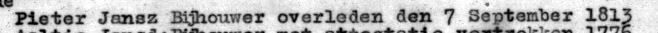 4. | v | Sijtje (Sijtje) Cornelis WAGEMAKER [3507]. Geb. op 21-07-1750 te Wieringen (bron: ?), ged. (Doopsgezind) op 26-03-1769 te Wieringen (bron: DTB Wieringen inv nr 21). ![]() Overl. op 07-05-1785 te Twisk op 34-jarige leeftijd (aang.: Pieter Jansz Bijhouwer) (bron: DTB Abbekerk inv nr 9), aangifte op 12-05-1785 ![]() Op 09-03-1777 net attestatie naar Abbekerk/Twisk (bron: ?) - Op 23-03-1777 met attestatie van Wieringen te Twisk (bron: DTB Twisk inv nr 8) ![]() - Op 10-08-1780 met attestatie vertrokken (bron: DTB Twisk inv nr 8) ![]() Otr. [1284] op 15-12-1774 te Abbekerk (bron: DTB Abbekerk inv nr 8). ![]() Echtgenoot is Pieter (Pieter) Jansz BIJHOUWER [3508]. Geb. ±1754 te ? (bron: ?), ged. (Doopsgezind) op 03-04-1774 te Twisk (bron: ?). Overl. op 07-09-1813 te Twisk (bron: DTB Twisk inv nr 8). ![]() Zn. van Jan (Jan) Klaasz BIJHOUWER [3509] en Dieuwertje (Dieuwertje) KOSTER [3510]. Pieter Jansz BIJHOUWER hertrouwd: Otr.[1285] op 03-11-1787 te Abbekerk (bron: DTB Abbekerk inv nr 8) ![]() met Grietje (Grietje) Joosts SCHUIT [3511] geb. op ? te ?, ged. op ? te ?, overl. op ? te ?,, begr. op ? te ?, dv: Joost (Joost) SCHUIT [3512] en ? (?) ? [3513]. |