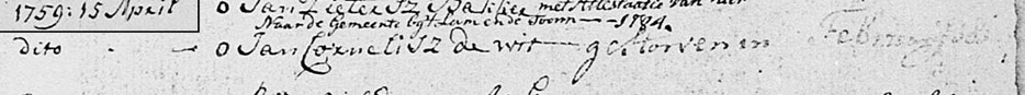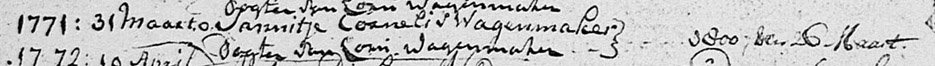 8. | v | Grietje (Grietje) Cornelis WAGEMAKER [3518]. Geb. op 18-08-1756 te Wieringen (bron: ?). Overl. op 28-03-1759 te Wieringen op 2-jarige leeftijd (bron: ?), begr. ? te ? |