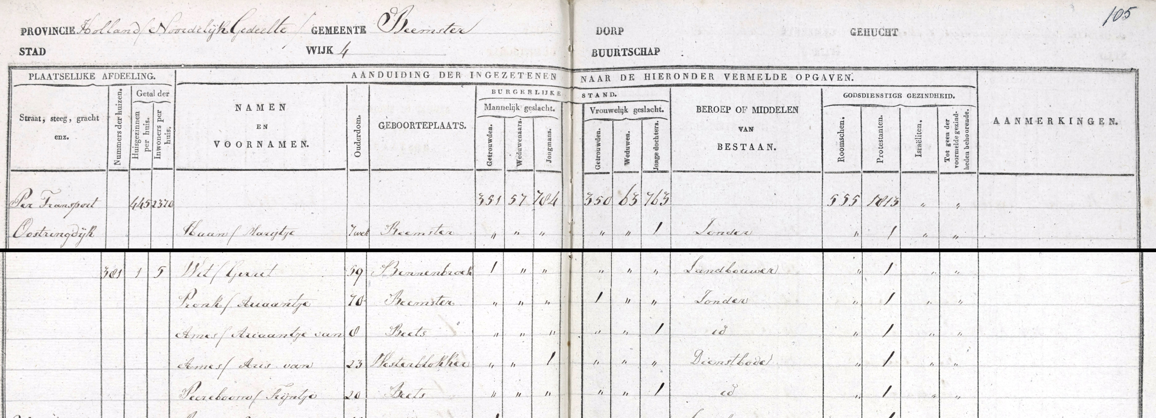 | 2. | v | Ariaantje (Ariaantje) Dirks PRONK [18453]. Geb. ±10-1759 te ? (bron: ?), ged. (NG) op 28-10-1759 te Beets (bron: DTB Beets inv nr 1). Overl. op 14-02-1831 te Beemster (bron: BS Beemster). Otr. (1) [9685] op 02-02-1783 te Beemster (bron: DTB Beemster inv nr 4c + 8b). Echtgenoot is Aris (Aris) Paulusz BOON [32305]. Geb. ? te ? Ged. ? te ? Overl. ? te ? Begr. ? te ? Zn. van Paulus (Paulus) BOON [32306] en ? (?) ? [32307]. Otr. (2) [9680] ? te ? Tr. rond 1804 te ? (bron: ?), tr. kerk ? te ? Echtgenoot is Gerrit (Gerrit) Albertsz WIT [32290]. Geb. ±09-1770 te Benningbroek (bron: ?), ged. (NG) op 08-09-1770 te Benningbroek (bron: DTB Benningbroek inv nr 1). Overl. op 24-07-1851 te Beemster (bron: BS Beemster). Zn. van Albert (Albert) Gerritsz WIT [32291] en Maartje (Maartje) Jans LEEK (Gool) [32292]. Gerrit Albertsz Wit hertrouwd: Otr.[9681] ? te ? Tr. op 23-07-1837 te Beets (bron: BS Beets). Met Immetje (Immetje) Jans PRONK [32293]. Geb. ±09-1775 te Etersheim (bron: ?), ged. (NG) op 24-09-1775 te Etersheim (bron: DTB Oosthuizen inv nr 13). Overl. op 26-09-1849 te Oosthuizen (bron: BS Oosthuizen). Dr. van Jan (Jan) PRONK [32294] en Trijntje (Trijntje) Tijs KRUIJTHOFF [32295]. Immetje Jans Pronk was weduwe: Otr. [9684] op 07-01-1798 te Schardam (bron: DTB Oosthuizen inv nr 15). Met Jan (Jan) ZUIDLAND [32300]. Geb. ±12-1768 te Beets (bron: ?), ged. (NG) op 26-12-1768 te Beets (bron: DTB Beets inv nr 1). Overl. op 06-03-1825 te Beets (bron: BS Beets). Zn. van Pieter (Pieter) ZUIDLAND [32303] en Maartje (Maartje) VISSER [32304]. Immetje Jans Pronk was weduwe: Otr. [9682] op 19-08-1827 te Beemster (bron: BS Beemster). Met Simon (Simon) Jansz LAKEMAN [32296]. Geb. ±01-1756 te Beemster (bron: ?), ged. (NG) op 04-01-1756 te Beemster (bron: DTB Beemster inv nr 2). Overl. op 08-09-1836 te Beets (bron: BS Beets). Zn. van Jan (Jan) Simonsz LAKEMAN [32297] en Guurtje (Guurtje) Louwrens HOGETOORN [32298]. Simon Jansz Lakeman was weduwnaar: Otr. [9683] op 28-11-1779 te Beemster (bron: DTB Beemster inv nr 4c + 8b). Met Lijsbeth (Lijsbeth) Klaas KRAMER [32299]. Geb. ±03-1758 te Warder (bron: ?), ged. (NG) op 12-03-1758 te Warder (bron: DTB Warder inv nr 6b). Overl. op 25-08-1826 te Beemster (bron: BS Beemster). Dr. van Klaas (Klaas) KRAMER [32301] en Geertje (Geertje) BIJL [32302]. Woonplaatsen na hun huwelijk: - Op __-__-____ Beemster - Oostringdijk 381 (bron: volkstelingsregister Beemster 1830 inv nr 1) |