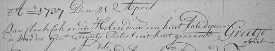 | 10. | v | Lijsbeth (Lijsbeth) Jans KOK [16530]. Geb. ±02-1758 te ? (bron: ?), ged. (NG) op 19-02-1758 te Beemster (bron: DTB Beemster inv nr 2b). Overl. ? te ? Begr. ? te ? |