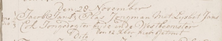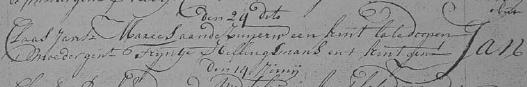 | 3. | m | Jan (Jan) Klaasz HELLINGMAN MAREES [13858]. Geb. ±07-1741 te ? (bron: ?), ged. (NG) op 23-07-1741 te Beemster (bron: DTB Beemster inv nr 2b). Overl. ? te ? Begr. ? te ? - Op __-09-1778 vermeld in lidmatenregister NG gemeete de Beemster (bron: DTB Beemster inv nr 4) Otr. [4342] ? te ? Tr. ? te ? Tr. kerk ? te ? Echtgenote is Marijtje (Marijtje) Gerrits KLEIJN [13859]. Geb. ? te ? Ged. ? te ? Overl. ? te ? Begr. ? te ? Dr. van Gerrit (Gerrit) CLEEN [13860] en ? (?) ? [13861]. |