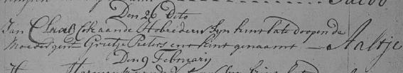 | 8. | v | Aaltje (Aaltje) Jans KOK [16528]. Geb. ±01-1755 te ? (bron: ?), ged. (NG) op 26-01-1755 te Beemster (bron: DTB Beemster inv nr 2b). Overl. ? te ? Begr. ? te ? |