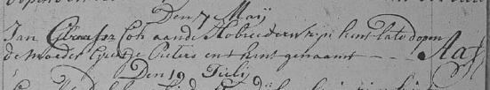 | 11. | v | Aafje (Aafje) Jans KOK [16531]. Geb. ±05-1761 te ? (bron: ?), ged. (NG) op 07-05-1761 te Beemster (bron: DTB Beemster inv nr 2b). Overl. ? te ? Begr. ? te ? |