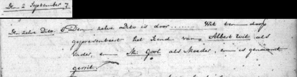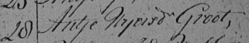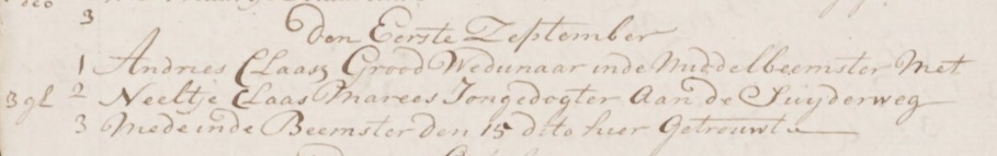 | 4. | v | Neeltje (Neeltje) Klaas MAREES [13851]. Geb. ±03-1748 te ? (bron: ?), ged. (NG) op 31-03-1748 te Beemster (bron: DTB Beemster inv nr 2b). Overl. ? te ? Begr. ? te ? - Op __-09-1778 vermeld in lidmatenregister NG gemeete de Beemster (bron: DTB Beemster inv nr 4) Otr. [4340] op 01-09-1771 te Beemster (bron: DTB Beemster inv nr 8b). Echtgenoot is Andries (Andries) Klaasz GROOD [13852]. Geb. ? te ? Ged. ? te ? Overl. ? te ? Begr. ? te ? Zn. van Klaas (Klaas) GROOD [13853] en ? (?) ? [13854]. - Op __-09-1778 vermeld in lidmatenregister NG gemeete de Beemster (bron: DTB Beemster inv nr 4) - Op 25-03-1802 krijgen Jan Klaasz Marees, Neeltje (klaas) Marees en Pieter (klaasz) Marees kinderen van Klaas Janz Marees graf nr 15 in bezit. De laatste twee verkopen hun deel aan de eerste. (bron: DTB Beemster inv nr 4d + 18) |
