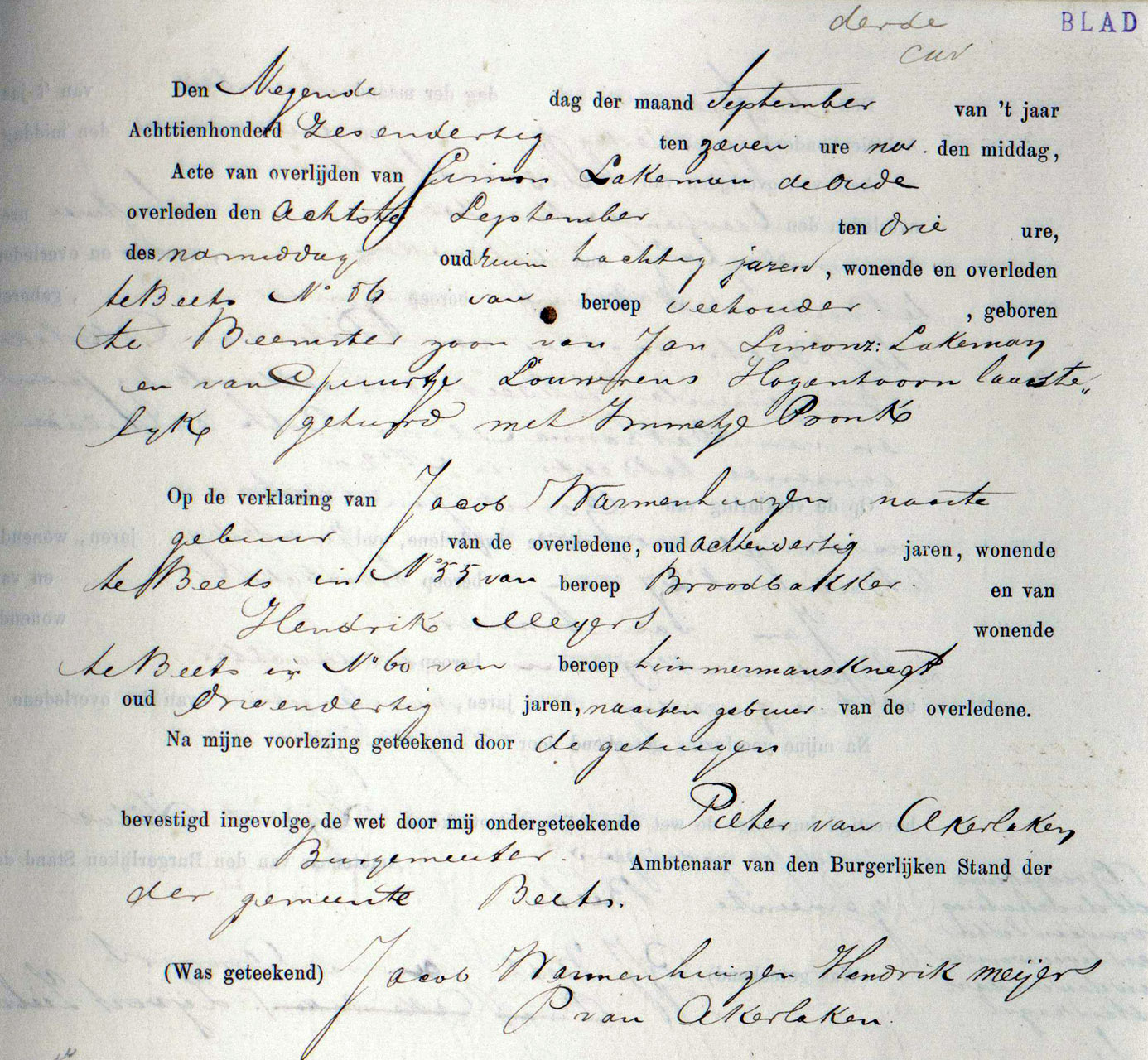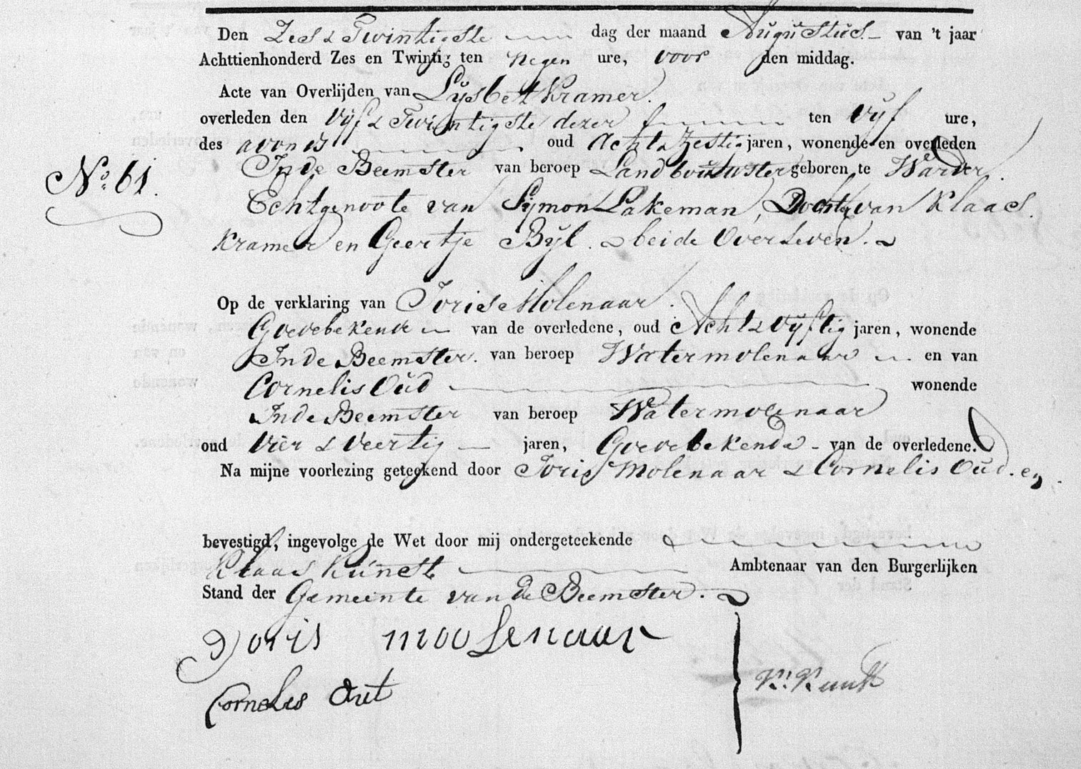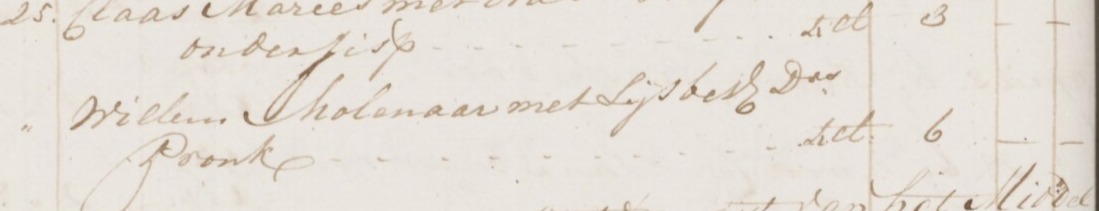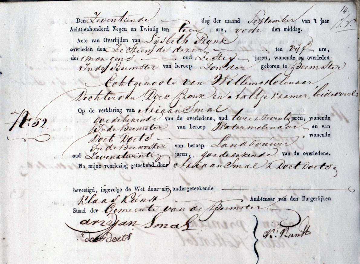 | 5. | v | Lijsbeth (Lijsbeth) Dirks PRONK [18455]. Geb. ±11-1769 te ? (bron: ?), ged. (NG) op 30-11-1769 te Beets (bron: DTB Beets inv nr 1). Overl. op 16-09-1829 te Beemster (bron: BS Beemster). Otr. [9861] op 25-04-1797 te Beemster (bron: DTB Beemster inv nr 20 + 42). Echtgenoot is Willem (Willem) Cornelisz MOLENAAR [32882]. Geb. ±06-1772 te Beemster (bron: ?), ged. (NG) op 21-06-1772 te Beemster (bron: DTB Beemster inv nr 3). Overl. op 05-12-1843 te Beemster (bron: BS Beemster). Zn. van Cornelis (Cornelis) Jorisz MOLENAAR [32883] en Lijsbet (Lijsbet) Willems BALK [32884]. |