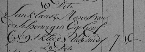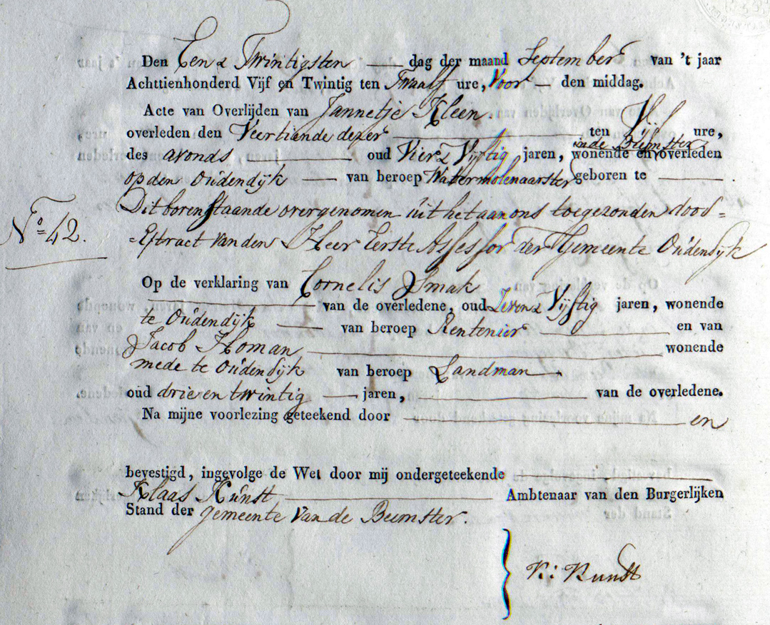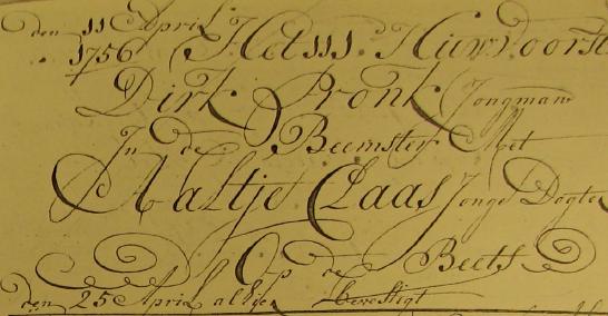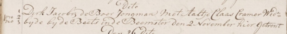 | 4. | m | Klaas (Klaas) Dirksz PRONK [18454]. Geb. ±11-1765 te ? (bron: ?), ged. (NG) op 03-11-1765 te Beets (bron: DTB Beets inv nr 1). Overl. op 14-07-1815 te Beemster (aang.: oa Cornelis Pronk (52) broer van de overledene) (bron: BS Beemster). Otr. [9858] op 10-01-1796 te Beemster (bron: DTB Beemster inv nr 20). Echtgenote is Jannetje (Jannetje) Pieters KLEEN [32875]. Geb. ±08-1772 te ? (bron: ?), ged. (NG) op 09-08-1772 te Kwadijk (bron: DTB Kwadijk inv nr 1a). Overl. op 14-09-1825 te Beemster (bron: BS Beemster). Dr. van Pieter (Pieter) Pietersz KLEEN [32880] en Geertje (Geertje) Barends KLOK [32881]. |