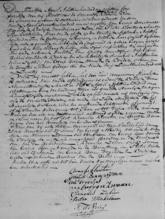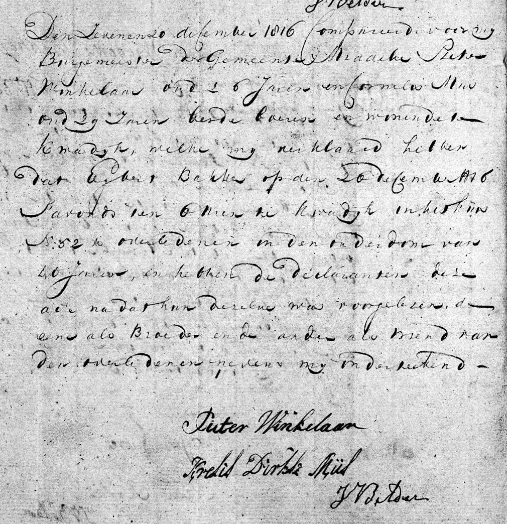 5. | m | Jacob (Jacob) Pietersz BINNEWIJZEND [16451]. Geb. ±08-1770 te ? (bron: ?), ged. (NG) op 12-08-1770 te Beemster (get.: Grietje Berkhout) (bron: DTB Beemster inv nr 3 + 4 8). ![]() ![]() ![]() Overl. op 23-11-1823 te Beemster (bron: BS Beemster). ![]() Otr. [1825] op 13-12-1812 te Beemster (bron: BS Beemster). ![]() ![]() Echtgenote is Trijntje (Trijntje) Jans KLOK [5299], 17 jaar oud. Geb. op 11-01-1795 te Kwadijk (bron: DTB Kwadijk inv nr 2). ![]() ![]() Overl. op 07-04-1822 te Kwadijk op 27-jarige leeftijd (bron: BS Kwadijk). ![]() Dr. van Jan (Jan) Arendsz KLOK [5300] en Dieuwertje (Dieuwertje) Olpherts KUIN [5301]. |