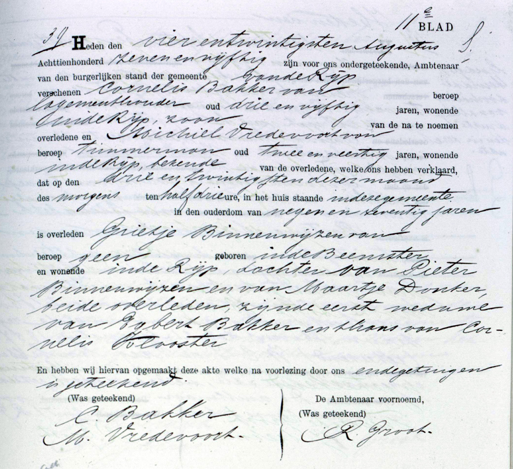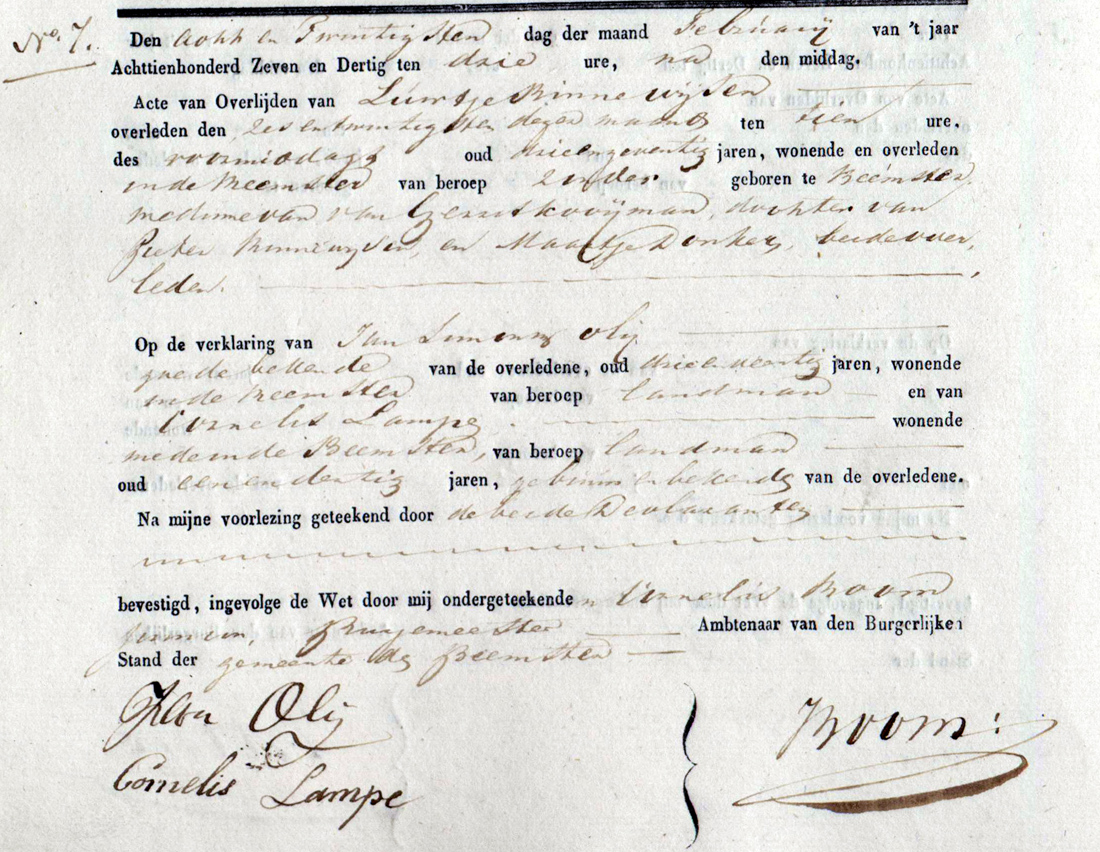 1. | v | Luutje (Luutje) Pieters BINNEWIJZEND [16454]. Geb. ±10-1763 te Beemster (bron: ?), ged. (NG) op 23-10-1763 te Beemster (bron: DTB Beemster inv nr 2b). ![]() Overl. op 26-02-1837 te Beemster (bron: BS Beemster). ![]() Otr. [9920] op 23-03-1788 te Beemster (bron: DTB Beemster inv nr 4c + 8b). ![]() ![]() ![]() ![]() ![]() ![]() Echtgenoot is Gerrit (Gerrit) Pietersz KOOIJMAN [33089]. Geb. ±07-1763 te ? (bron: ?), ged. (NG) op 17-07-1763 te Beemster (bron: DTB Beemster inv nr 2a). ![]() Overl. op 12-10-1835 te Beemster (bron: BS Beemster). ![]() Zn. van Pieter (Pieter) Gerritsz KOOIJMAN [33091] en Barbar (Barbar) Cornelis BOOT [33092]. |