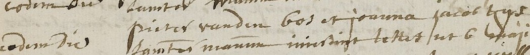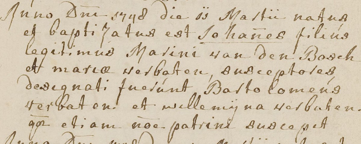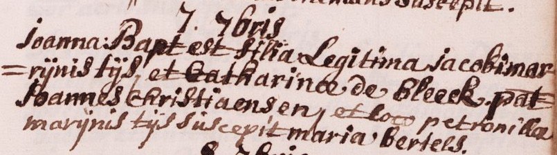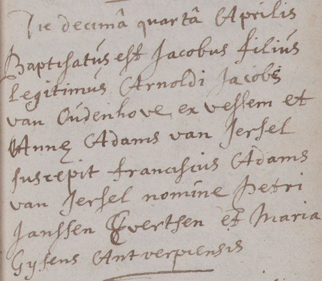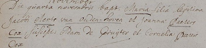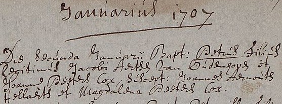 1. | m | Petrus (Petrus) Jacobusz van den OUDENHOVEN [9614]. Geb. ±01-1707 te ? (bron: ?), ged. (RK) op 02-01-1707 te Oudenbosch (get.: Johannes Arnoutsz Hellaarts en Magdalena Peters Cocks) (bron: DTB Oudenbosch RK dopen inv nr 4). ![]() Overl. voor 1712 te ? (bron: ?), begr. ? te ? |