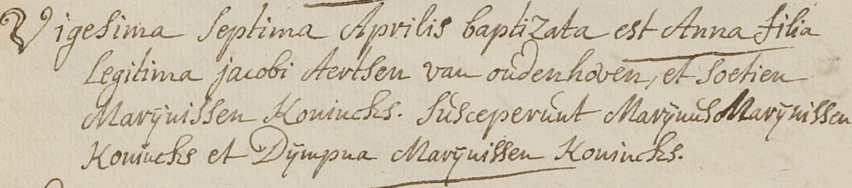 10. | v | Anna (Anna) Jacobus van den OUDENHOVEN [9622]. Geb. ±04-1727 te ? (bron: ?), ged. (RK) op 27-04-1727 te Oudenbosch (get.: Marinus Marinusz Konings en Dijmphna Marinus Konings) (bron: DTB Oudenbosch RK dopen inv nr 5). ![]() Overl. ? te ? Begr. ? te ? |
