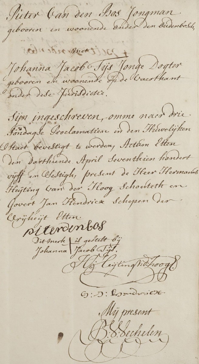 4. | m | Petrus (Pieter) Marinusz van den BOSCH [7641]. Geb. op 06-11-1741 te Oudenbosch (bron: DTB Oudenbosch RK dopen inv nr 5). ![]() ![]() Overl. op 09-01-1802 te Oudenbosch op 60-jarige leeftijd (bron: ? (BRABER)), begr. ? te ? - In 1770 worden in het hoofdgeld kohier van Oudenbosch genoemd Pieter van den Bos met zijn vrouw Janna Jacobs Tijs dochters Maria en Catharina zoon Marijn zuster Janna van den Bos, knechten Cornelis Custermans en Tomas van Akkere en de meid Jacoba Dam uit het Oudland (bron: ? (BRABER)). Otr. [2722] op 13-04-1765 te Etten Leur (bron: DTB Etten Leur schepenbank inv nr 23). ![]() ![]() ![]() Echtgenote is Johanna (Johanna) Jacobs TIJS [8375]. Geb. ±09-1735 te Etten (bron: ?), ged. (RK) op 07-09-1735 te Etten (get.: Johannes Christiaansz en Maria Bertels voor Petronella Marijnis Tijs) (bron: DTB Etten Leur RK dopen Etten inv nr 7). ![]() Overl. op 08-07-1782 te Oudenbosch (bron: DTB Oudenbosch RK begraven inv nr 7), begr. op 11-07-1782 te Oudenbosch (bron: DTB Oudenbosch RK begraven inv nr 7). Dr. van Jacob (Jacob) Marijnisz TIJS [8376] en Catharina (Catharina) de BLEECK [8377]. |