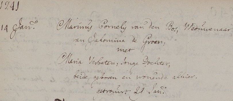 11. | v | Maria (Maria) Jacobus van den OUDENHOVEN [9623]. Geb. ±12-1729 te Oudenbosch (bron: ?), ged. (RK) op 17-12-1729 te Oudenbosch (get.: Cornelis Marinusz Konings en Maria van den Oudenhoven) (bron: DTB Oudenbosch RK dopen inv nr 5). ![]() Overl. ? te ? Begr. ? te ? Otr. [3115] op 19-03-1757 te Oudenbosch (bron: DTB Oudenbosch NH trouwen inv nr 11). ![]() ![]() Echtgenoot is Henricus (Hendrik) Johannesz VLUGGE [9629]. Geb. ±02-1718 te Oudenbosch (bron: ?), ged. (RK) op 17-02-1718 te Oudenbosch (get.: Antonius Vlugge en Christina Jans) (bron: DTB Oudenbosch RK dopen inv nr 4). ![]() Overl. op 14-05-1759 te Oudenbosch (bron: DTB Oudenbosch RK begraven inv nr 7), begr. op 16-05-1759 te Oudenbosch (bron: DTB Oudenbosch RK begraven inv nr 7). Zn. van Johannes (Jan) Hendriksz VLUGGE [9630] en Adriana (Adriana) Antonius van den BRANT [9631]. |