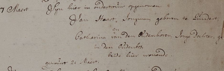 5. | v | Catharina (Catharina) Jacobus van den OUDENHOVEN [9617]. Geb. ±07-1715 te Oudenbosch (bron: ?), ged. (RK) op 23-07-1715 te Oudenbosch (get.: Cornelis Lindertsz en Cornelia Aerts van Oudenhoven) (bron: DTB Oudenbosch RK dopen inv nr 4). ![]() Overl. op 23-02-1774 te Oudenbosch (bron: DTB Oudenbosch RK begraven inv nr 7), begr. op 26-02-1774 te Oudenbosch (bron: DTB Oudenbosch RK begraven inv nr 7). - In 1770 worden in het hoofdgeld kohier van Oudenbosch genoemd Catharina van Oudenhove weduwe van Jan Oste en haar dochter Adriaana Oste uit de noordzijde van Oudenbosch(bron: ? (BRABER)). Otr. [3116] op 07-03-1750 te Oudenbosch (bron: DTB Oudenbosch NH trouwen inv nr 11). ![]() ![]() Echtgenoot is Johannes (Jan) Roelandsz HAAST (Oste) [9632]. Geb. ? te Zundert (bron: ?), ged. ? te ? Overl. op 09-12-1769 te Oudenbosch (bron: ?), begr. ? te ? Zn. van Roeland (Roeland) HAAST [9633] en ? (?) ? [9634]. |