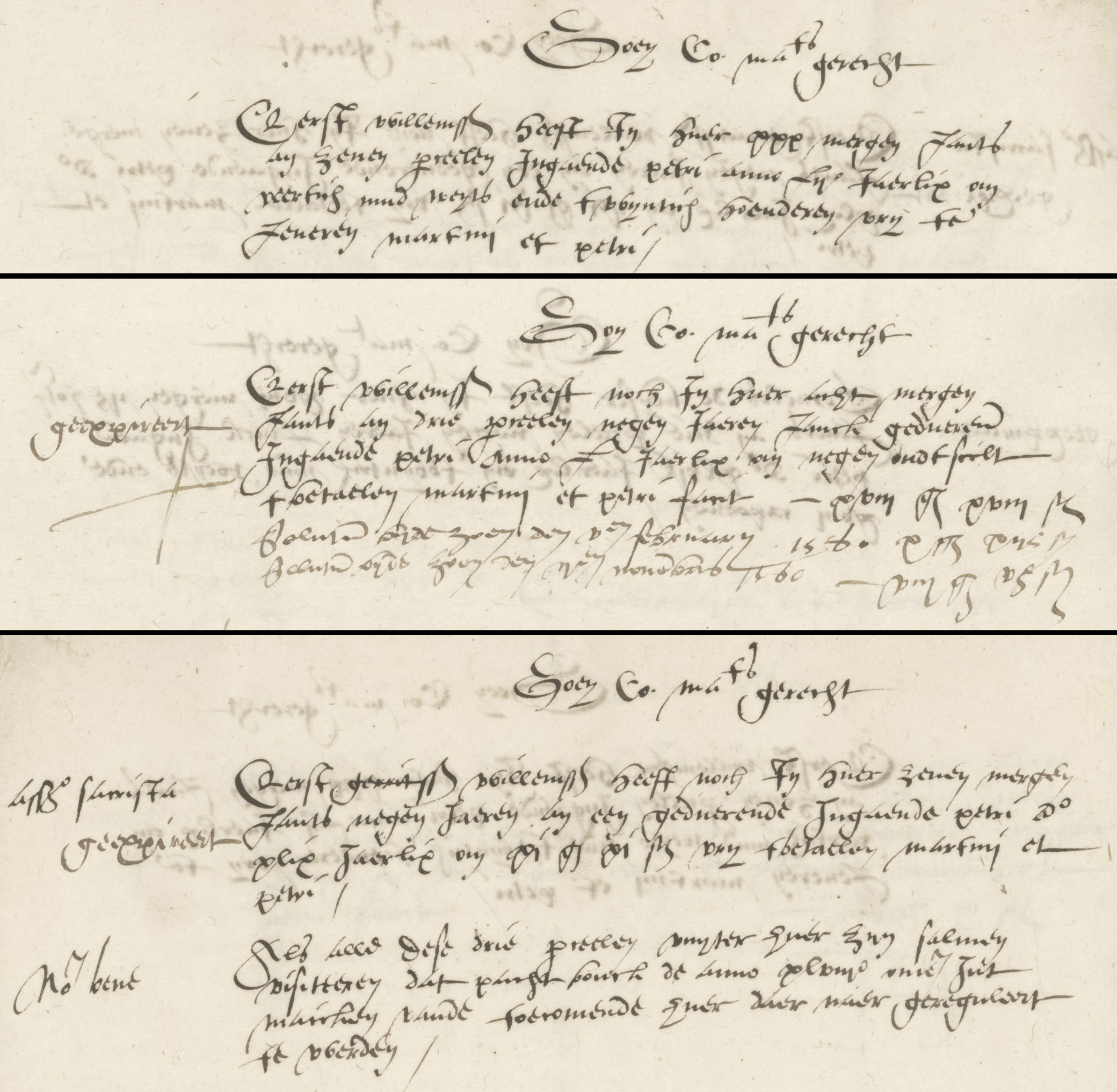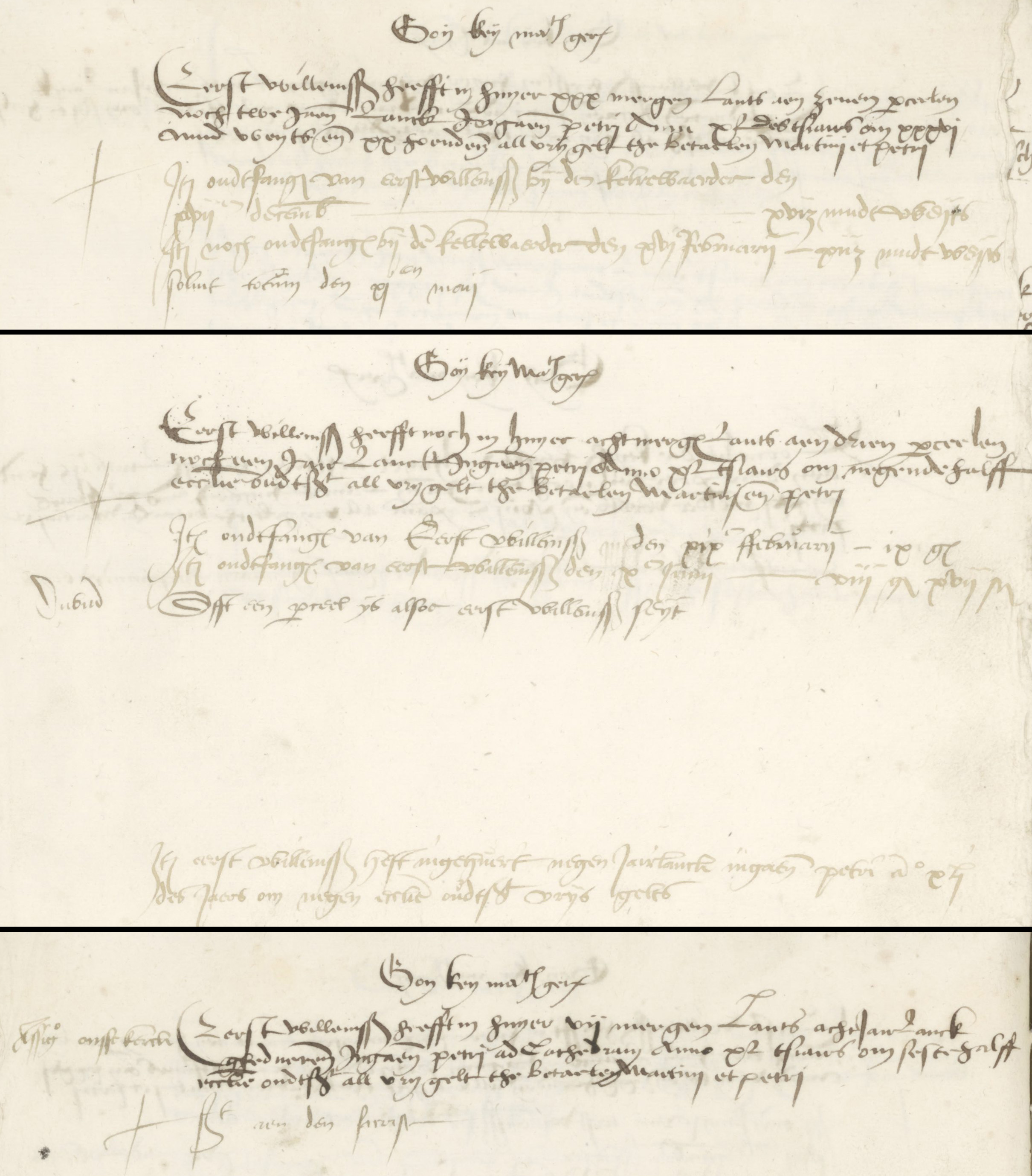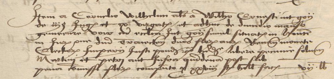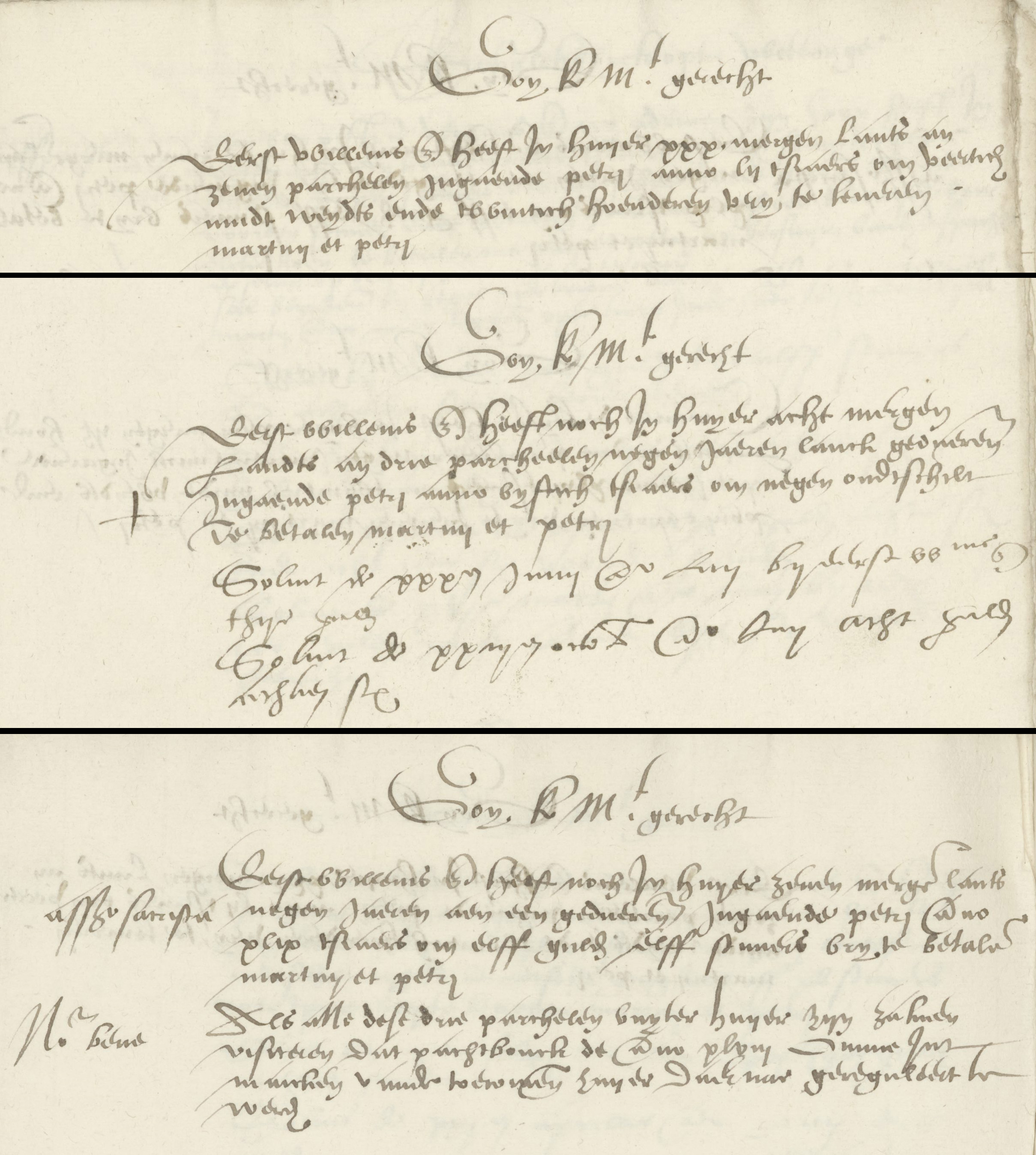 | 5. | v | Geertruida (Geertruida) Willems PAUW [29036]. Geb. ? te ? Ged. ? te ? Overl. ? te ? Begr. ? te ? - Op 10-07-1537 overdracht van de erfenis van Anthonis Eersten door zijn broer Jan Eerstensz aan o.a. de kinderen van broer Willem Eerstensz waaronder Geertruida Willems vrouw van Goijer Adriaans lijndraijer. (bron: 701-3 Hof Utrecht 704-23 fol 113) - Op 09-03-1560 worden de kinderen van Goeijert Adriaans genoemd als erfgenamen van wijlen hun oom Cornelis Adriaansz. Hij was gehuwd met Marichtje Goessens van Schaijk die inmiddels is hertrouwd met Hendrik Gerritsz. Genoemd worden de kinderen van wijlen zijn broers Goeijer Adriaansz en Jan Adriaansz. De erfenis betreft land in de Hoge en Lageweide. Genoemd worden Willem Goijertsz man Gerborch, Adriaan Goijertsz man van Dirkje, Geertruide Goijerts Adriaansz vrouw van Hendrik Jansz Block, Geertruida Jans Adriaansz vrouw van Hendrik Klaasz van der Laar, kinderen van Adriana Goijertsz Adriaansz en Cornelis en tot slot Aelbert van Doesburch man van Dirkje. Dit volgens 701 Utrecht 725 fol 110-111 (bron: ? (Utrechtse Parentelen voor 1650 deel 5)) - Op 13-01-1561 woont zij Geertruida weduwe van Goert Adrijaansz aan de tolsteeg naast Willem Goertsz lijndraaier. (bron: 701 Stadsbestuur van Utrecht inv nr 334-4) - Op 12-02-1561 draag Geertruida weduwe van Goort Adrijaans een huis en erfje aan de Tolsteeg over aan de stad Utrecht. (bron: 701 Stadsbestuur van Utrecht inv nr 334-5) - Op 12-02-1561 nogmaals overdracht door Geertruida weduwe van Goort Adrijaans van een erfje aan de oostzijde van de Tolsteeg over aan de stad Utrecht. Dit volgens 701 Utrecht 705-18 fol 55-56 (bron: ? (Utrechtse Parentelen voor 1650 deel 5)) - Op 29-04-1586 testament van Geertuida Willems Eerstensz weduwe van Goijert Adriaansz waarvooer haar op 07-06-1563 octrooi is verleend. Erfgenamen zijn haar zoons Willem Goijertsz en Cornelis Goijertsz en de kinderen van dochters Teuntje Goijertsz, Geertje Goijertsz zoon Jan Hendriksz Keijzer en tot slot haar zoons zoon Cornelis Adriaansz zoon van [Cornelis Adriaansz Goijertsz en] Elisabet. Dit volgens ONA Utrecht u003a004 (bron: ? (Utrechtse Parentelen voor 1650 deel 5)). Otr. [8727] ? te ? Tr. ? te ? Tr. kerk ? te ? Echtgenoot is Goijer (Goijer) Adriaansz ? [29037]. Geb. ? te ? Ged. ? te ? Overl. ? te ? Begr. ? te ? Zn. van Adriaan (Adriaan) ? [29038] en ? (?) ? [29039]. - Op 08-02-1537 overdracht van de erfenis binnen Utrecht van Antonius Eersten door Engbert Gijsbertsz man van Gouda [Gerrits van Wijk] uit 't Goy, Eerst Gerritsz [Eerstensz] man van Alida uit Houten, Dirk Sweersz man van Geertruida, namens Alida [Jans Eerstens] diens man Dirk Klaasz smid te Zoelmond aan Hendrik Willemsz [Eerstensz man van Haasje Jans Vos] en [Geertuida Willemsz Eerstensz vrouw van] Goijer Adriaansz. Antonius Eersten [man van Geertruida Jans Hendriks] is hun of hun partners oom. (bron: 701-3 Hof Utrecht 704-23 fol 25) - Op 23-01-1543 boedelscheiding van de erfgenamen van Anthonis Eerstensz en Gijsbertje Jans Hendriksz. Als erfgenamen van Antonis Eersten worden o.a. Geertuida [Willemsz Eerstensz] vrouw van Goijer Adriaansz lijndraaier. Er volgen een aantal verklaringen waaronder van Hendrik Willemsz [Eerstensz] en [de man van Geertuida Willemsz Eerstensz] en Goijer Adriaansz die verklaren de erfenis te hebben voldaan aan Engbert Gijsbertsz [man van Gouda Gerrits van Wijk] in 't Goy, Dirk Sweersz [man van Geertruida] te Schalkwijk, [Alida Jans Eerstensz man] Dirk [Klaasz] smid te Zoelmond, Akrijn Willemsz [Eerstensz] weduwe Maria en hun kinderen Antonius, Gijsbert, Maria, Jannetje, Cornelia, Anna en Magdalena. (bron: 701-3 Utrecht 704-29) - Op 16-03-1554 verwijzing naar uitspraak van 05-08-1552 waarin Goort Adriaansz lijndraier optrad voor Elisabeth Vossen weduwe van Marcel Gerritsz [Marcelsz] in een zaak tussen haar en Geertuida weduwe van Spijker Gerritsz uit Hagestein. Ook op 22-09-1552 heeft Elisabeth Vossen een bij het gerrecht geweest om te verklaren dat ze in 1544 met Marcel in gemeenschap van goederen was getrouwd te Utrecht. Verder genoemd de zus van wijlen Marcel Gerritsz [Marcelsz] Celij Gerrits Marcellisz en haar man Cornelis Albertsz en zijn broer Cornelis Gerritsz [Marcelisz]. (bron: 239-1 Hof Utrecht inv nr 188-3 fol 286) |