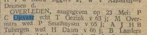 2. | m | Theodorus Adrianus (Theodorus Adrianus) OJEVAAR [119] ![]() Geb. op 10-01-1865 te Amsterdam (bron: BS Amsterdam), ged. ? te ? Overl. op 27-01-1893 te Amsterdam op 28-jarige leeftijd (bron: BS Amsterdam), begr. ? te ? |