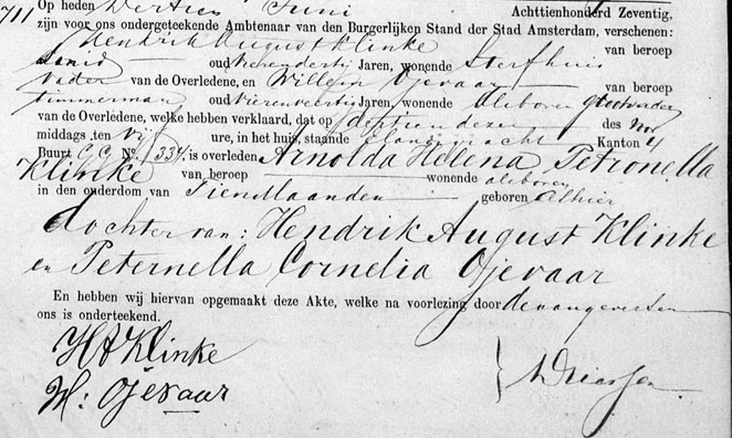 4. | m | Jan (Jan) OJEVAAR [121] ![]() Geb. op 28-01-1871 te Amsterdam (bron: BS Amsterdam), ged. ? te ? Overl. op 19-02-1871 te Amsterdam, 22 dagen oud (bron: BS Amsterdam), begr. ? te ? |