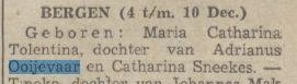 5. | v | Maria Catharina Tolentina (Maria Catharina Tolentina) OOIJEVAAR [1465] ![]() Geb. ±12-1941 te Bergen (bron: advertentie). ![]() |