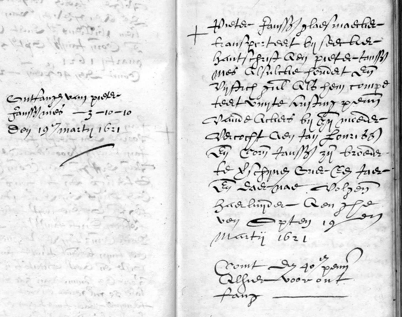 ontfangne van Pieter Janssz Mes - 3 - 10 - 10 den 19en martij 1621 | Pieter Jansz Glaesmaecker transporteert bij seecker hantschrift aen Pieter Janssz Mes alsulcke hondert ende vijftich gul[den] als hem compe teert uuijte kusting penn[ingen] van de ackers bij zijn moeder vercocht aen Jan Lourisz ende Corn[elis] Jansz zijn broeder te verschijnen over een jaer ende daer nae volgende haerluijder aenghe ven opten 19en martij 1621 comt den 40en penn[ing] alhier voor ont
