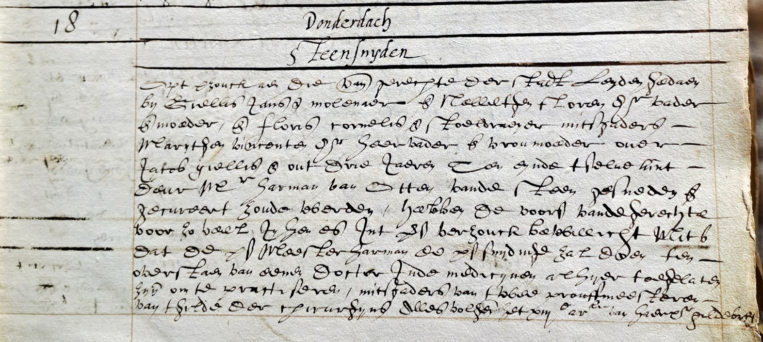 donderdach steensnijden op t verzouck aen die van[de] gerechte der stadt Leijden gedaen bij Giellis Jansz molenaer ende Nelletgen Florendr vader ende moeder ende Floris Cornelis stoelendraeijer mitsgaders Marijtgen Vincentedr haer vader ende vroumoeder over Jacob Giellisz out drie jaeren ten eijnde t selve kint daer m[eeste]r Harman van Otten van de steen gesneden ende gecureert zoude werden hebben de voorsz[egde] van de gerechte