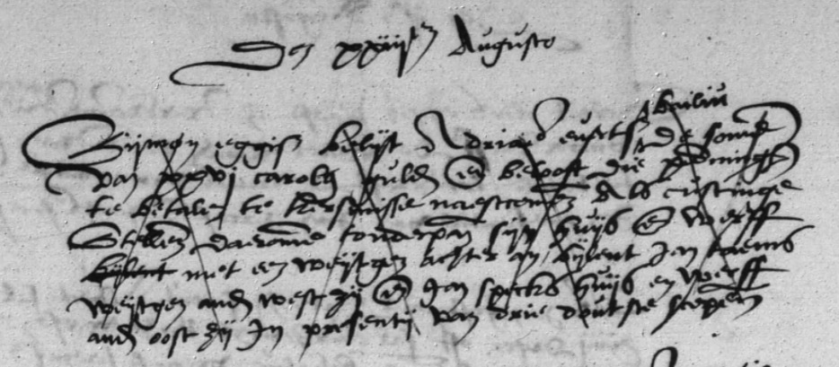 den XXIIJen augusto Sijmon Eggisz belijt Adrians Evertszbailiu de som[m]e van XXVJ carolij gulden ende belooft die penningen te betalen te kersmisse naescomen[de] als custinge stellen[de] daerom[m]e t onderpan[d] sijn huijs en[de] werff