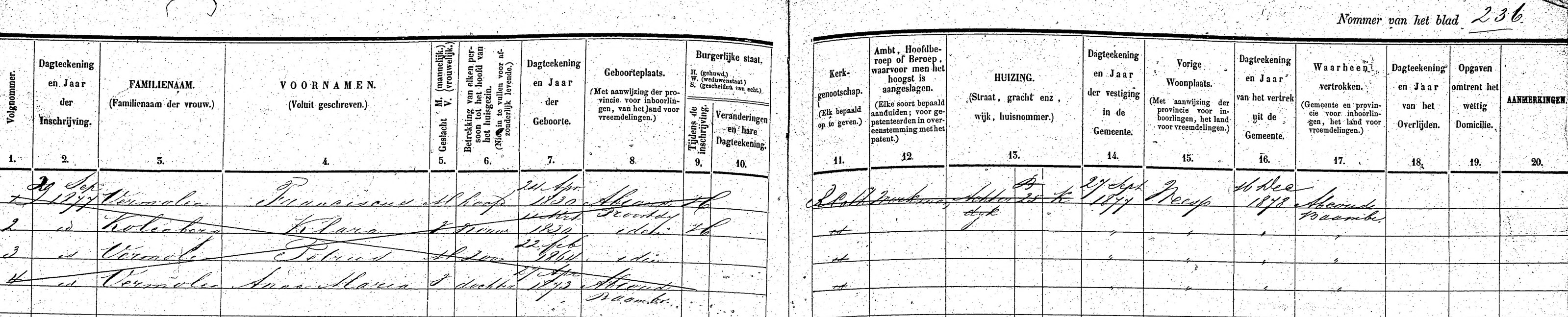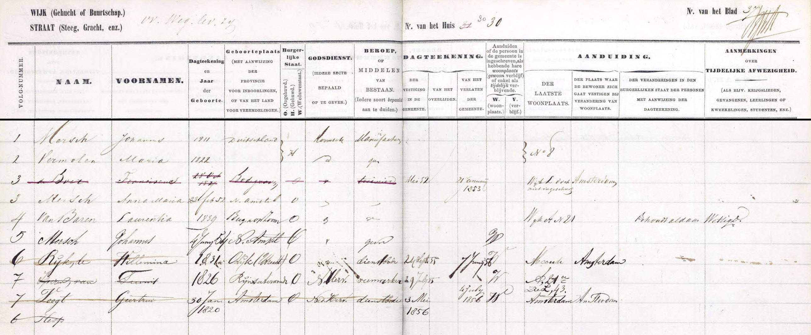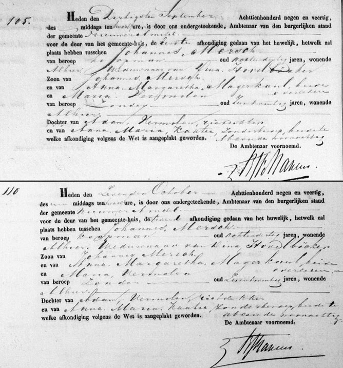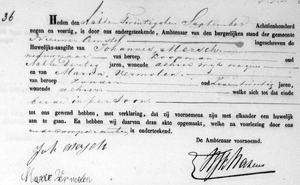 | 4. | v | Maria (Maria) VERMOOLEN [7520]. Geb. op 05-10-1822 te Abcoude Baambrugge (bron: BS Abcoude Baambrugge). Overl. op 15-03-1880 te Nieuwer Amstel op 57-jarige leeftijd (bron: BS Nieuwer Amstel). Otr. [2761] op 28-09-1849 te Nieuwer Amstel (bron: BS Nieuwer Amstel). Echtgenoot is Johannes (Johannes) MERSCH [8501], 38 jaar oud, koopman. Geb. op 15-01-1811 te Osterwiehe (DE) (bron: DTB Kaunitz inv nr KB001-01-T + KB001b-01-zt). Overl. op 07-06-1883 te Nieuweramstel op 72-jarige leeftijd (bron: BS Nieuweramstel). Zn. van Johannes (Johannes) MERSCH [8502] en Anna Margaretha (Anna Margaretha) MAGERKAUL [8503]. Johannes Mersch was weduwnaar: Otr. [3451] ? te ? Tr. 08-1845 (bron: ?), tr. kerk op 12-08-1845 te Kaunitz (RK) (bron: DTB Kaunitz inv nr KB006-01-H). Geb. op 13-01-1818 te Osterwiehe (DE) (bron: DTB Kaunitz inv nr KB001-01-t + KB001-01b-zt). Overl. op 12-04-1849 te Nieuwer Amstel op 31-jarige leeftijd (bron: BS Nieuwer Amstel). Dr. van Jacobus (Jacobus) HOVELBÖKER [10801] en Anna Maria (Anna Maria) STROETDIECKER [10802]. Woonplaatsen na vertrek ouderlijkhuis te _: - Op 31-12-1859 Nieuwer Amstel - K8, K30 (bron: bevolkingsregister Nieuwer Amstel 1850-1860 inv nr 10 + 1860-1870 inv nr 24 + 1869-1876 inv nr 58) |