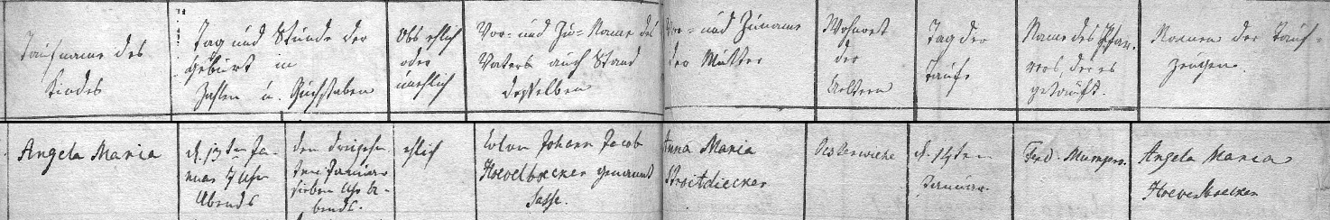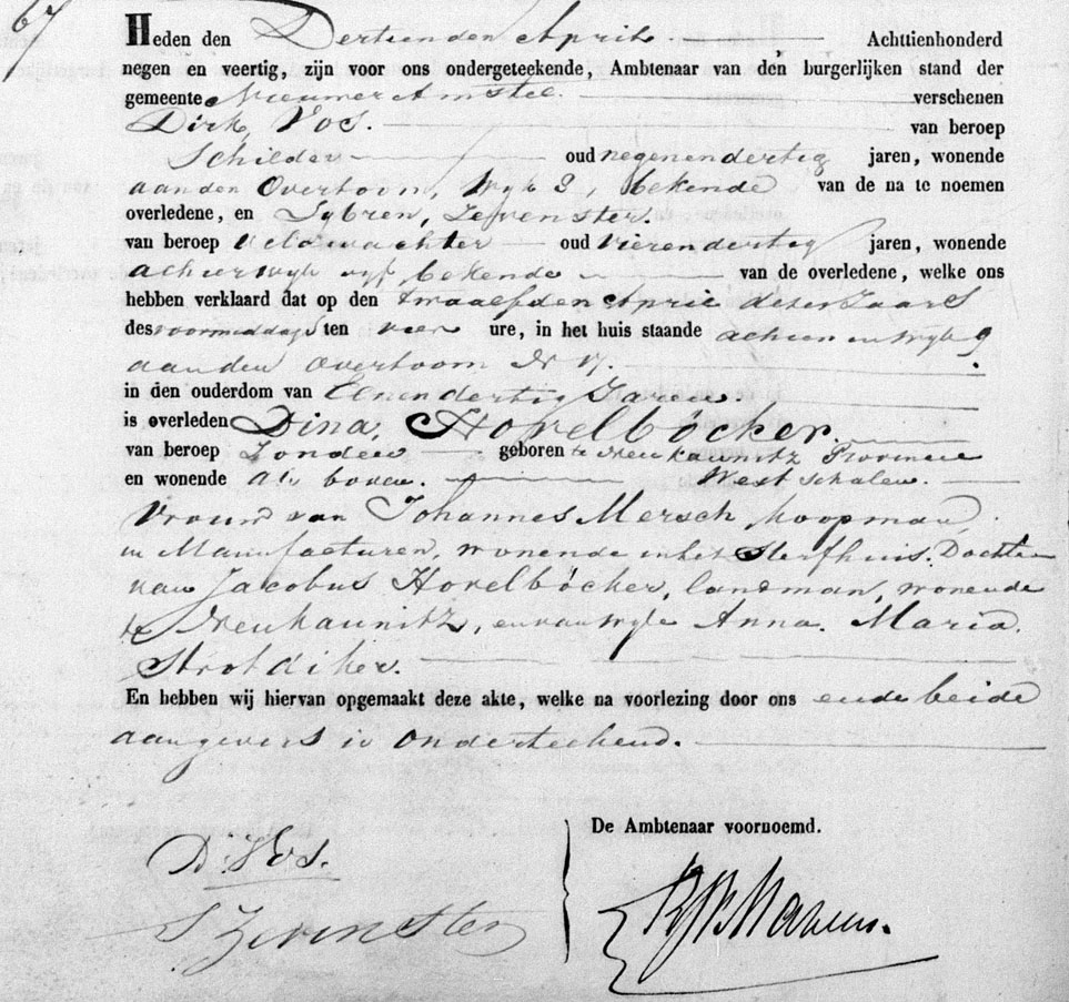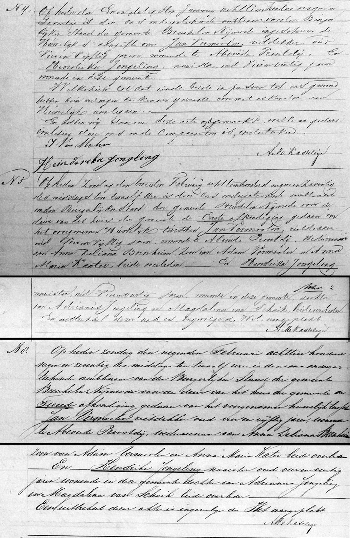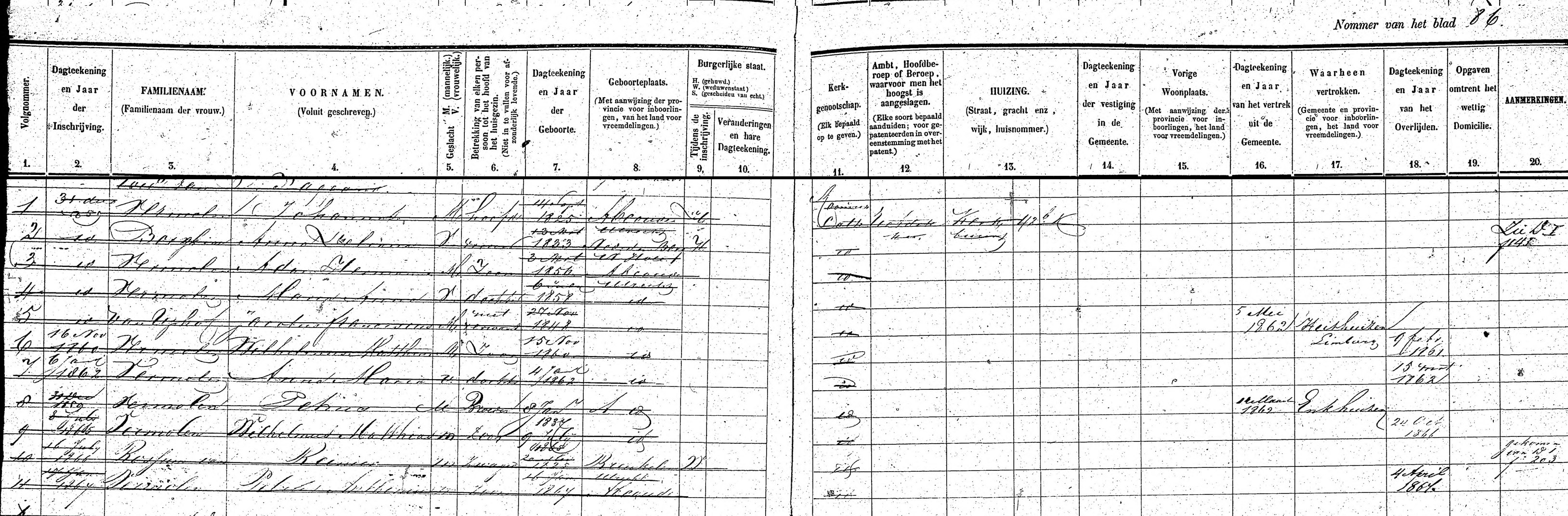 | 4. | v | Maria (Maria) VERMOOLEN [7520]. Geb. op 05-10-1822 te Abcoude Baambrugge (bron: BS Abcoude Baambrugge). Overl. op 15-03-1880 te Nieuwer Amstel op 57-jarige leeftijd (bron: BS Nieuwer Amstel). Otr. [2761] op 28-09-1849 te Nieuwer Amstel (bron: BS Nieuwer Amstel). Echtgenoot is Johannes (Johannes) MERSCH [8501], 38 jaar oud, koopman. Geb. op 15-01-1811 te Osterwiehe (DE) (bron: DTB Kaunitz inv nr KB001-01-T + KB001b-01-zt). Overl. op 07-06-1883 te Nieuweramstel op 72-jarige leeftijd (bron: BS Nieuweramstel). Zn. van Johannes (Johannes) MERSCH [8502] en Anna Margaretha (Anna Margaretha) MAGERKAUL [8503]. Johannes Mersch was weduwnaar: Otr. [3451] ? te ? Tr. 08-1845 (bron: ?), tr. kerk op 12-08-1845 te Kaunitz (RK) (bron: DTB Kaunitz inv nr KB006-01-H). Geb. op 13-01-1818 te Osterwiehe (DE) (bron: DTB Kaunitz inv nr KB001-01-t + KB001-01b-zt). Overl. op 12-04-1849 te Nieuwer Amstel op 31-jarige leeftijd (bron: BS Nieuwer Amstel). Dr. van Jacobus (Jacobus) HOVELBÖKER [10801] en Anna Maria (Anna Maria) STROETDIECKER [10802]. Woonplaatsen na vertrek ouderlijkhuis te _: - Op 31-12-1859 Nieuwer Amstel - K8, K30 (bron: bevolkingsregister Nieuwer Amstel 1850-1860 inv nr 10 + 1860-1870 inv nr 24 + 1869-1876 inv nr 58) |