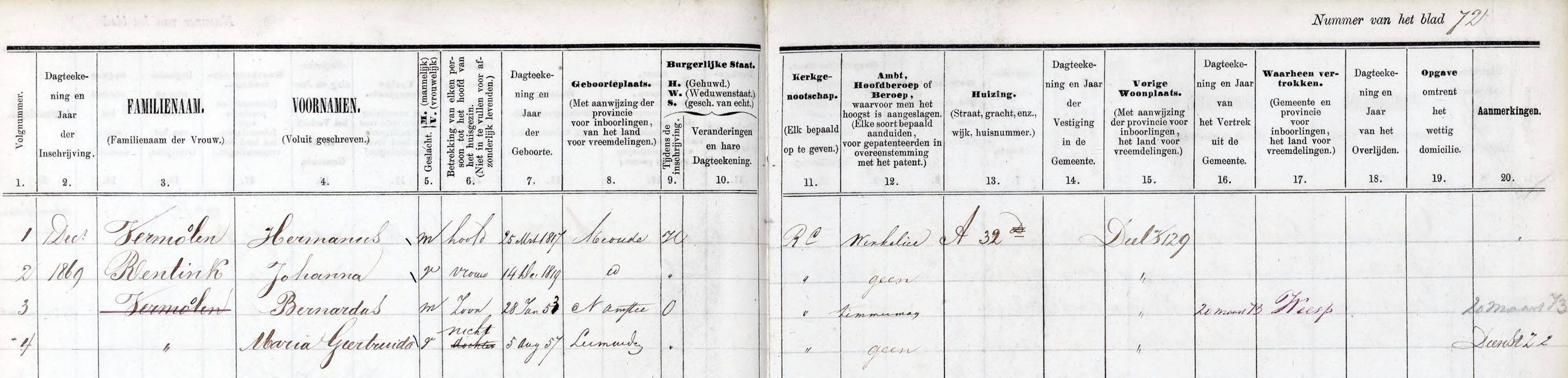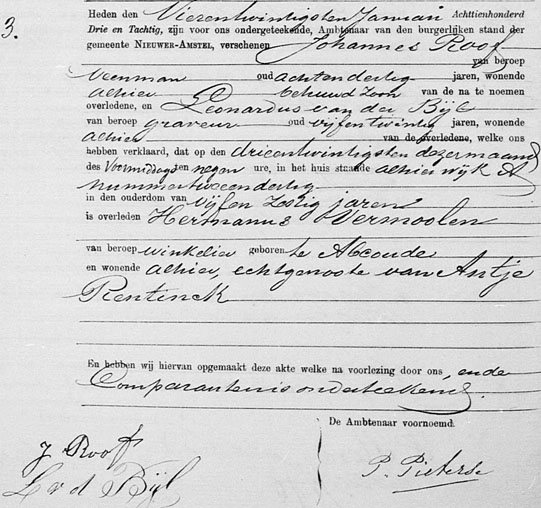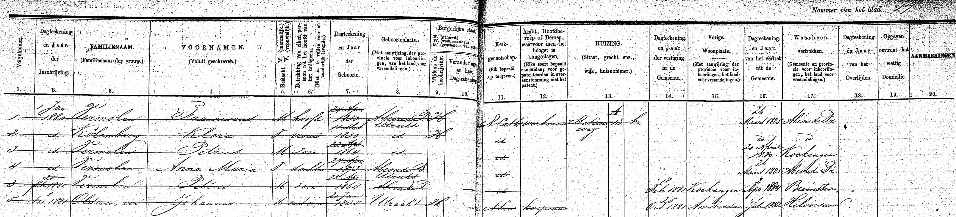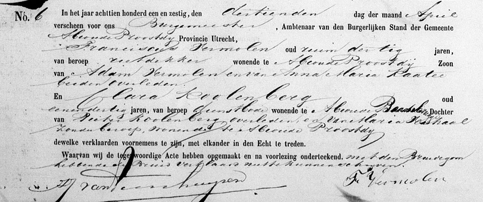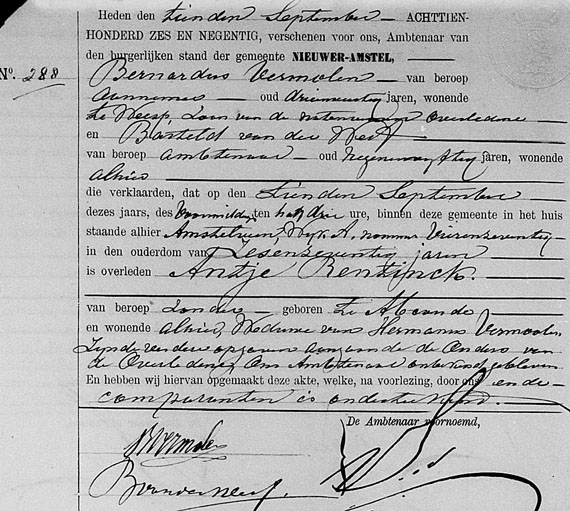 | 1. | m | Hermanus (Hermanus) VERMOOLEN [445], winkelier. Geb. op 25-03-1817 te Abcoude Baambrugge (bron: BS Abcoude Baambrugge). Overl. op 23-01-1883 te Nieuwer Amstel op 65-jarige leeftijd (bron: BS Nieuwer Amstel). Otr. [119] op 27-05-1846 te Abcoude-Proostdij (bron: BS Abcoude-Proostdij). Echtgenote is Antje (Antje) RENTINK [448], 26 jaar oud. Geb. op 13-10-1819 te Abcoude Baambrugge (bron: BS Abcoude). Overl. op 10-09-1896 te Nieuwer-Amstel op 76-jarige leeftijd (bron: BS Nieuwer-Amstel). Dr. van Bernardus (Bernardus) RENTINK [449] en Teresia (Teresia) de BOER [450]. Woonplaatsen na vertrek ouderlijkhuis te _: - Op 31-12-1859 Nieuwer Amstel - A39, A32, 66 (bron: bevolkingsregister Nieuwer Amstel 1850-1860 inv nr 1 + 1860-1870 inv nr 31 + 1869-1876 inv nr 39 + 1876-1880 inv nr 69) |