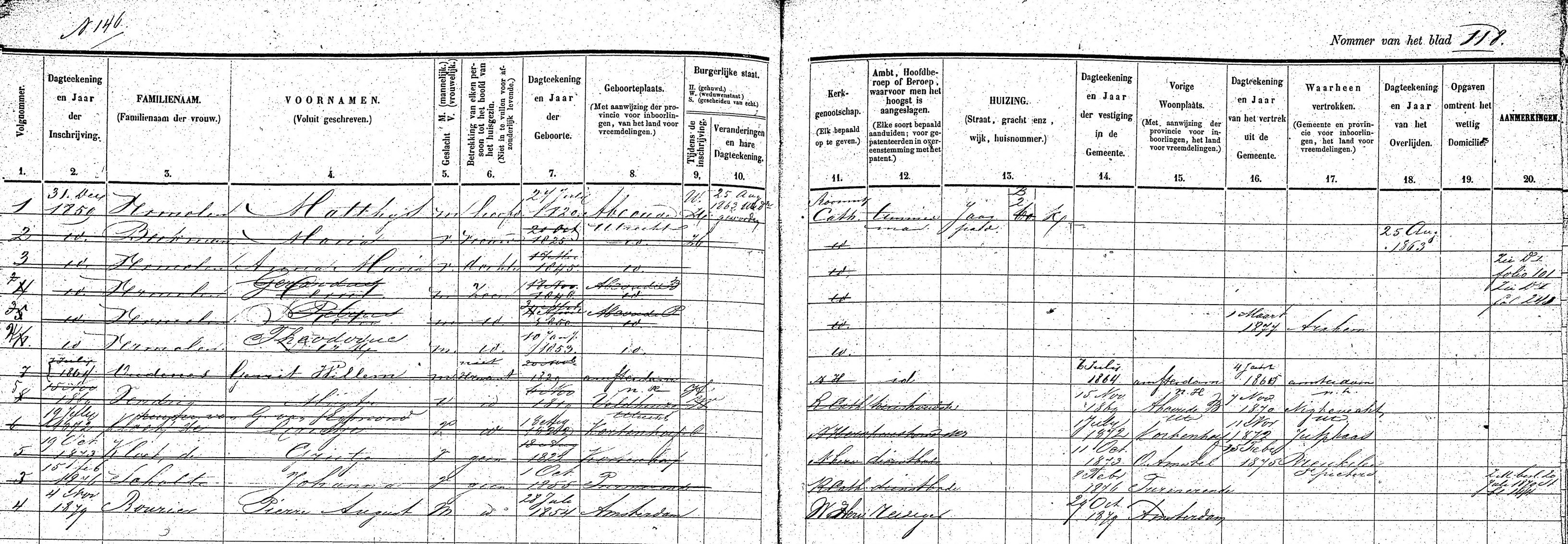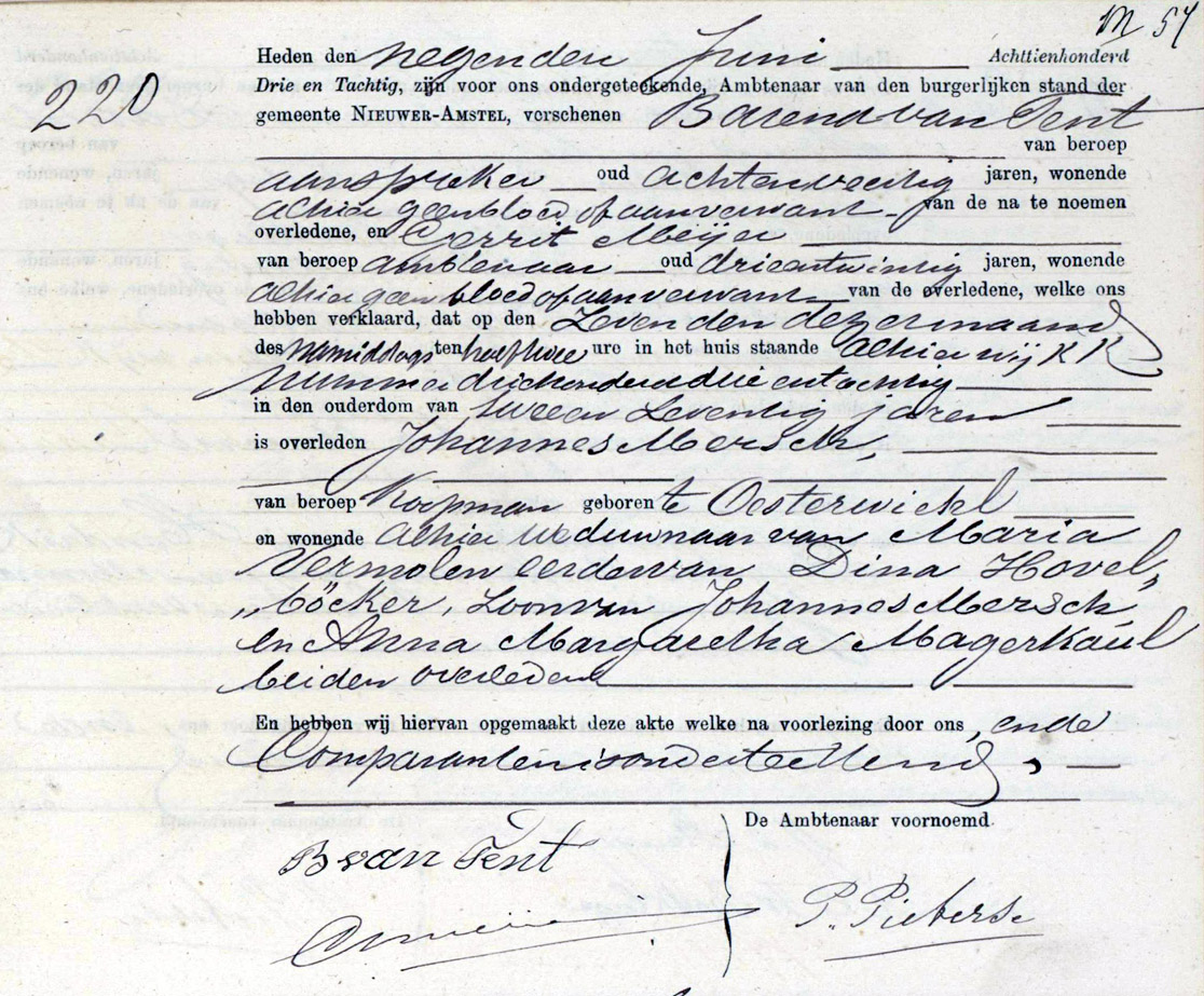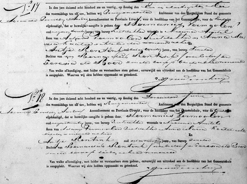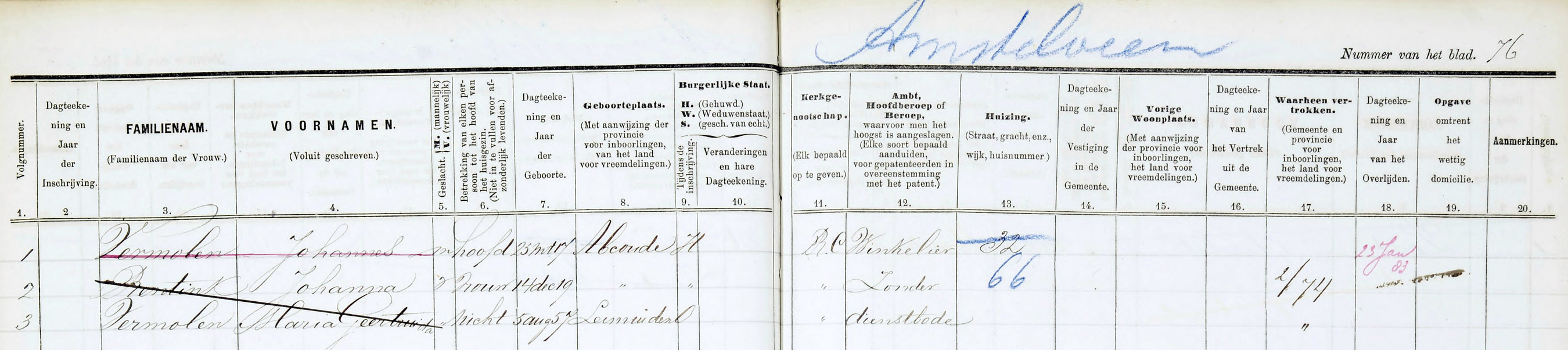 | 1. | m | Hermanus (Hermanus) VERMOOLEN [445], winkelier. Geb. op 25-03-1817 te Abcoude Baambrugge (bron: BS Abcoude Baambrugge). Overl. op 23-01-1883 te Nieuwer Amstel op 65-jarige leeftijd (bron: BS Nieuwer Amstel). Otr. [119] op 27-05-1846 te Abcoude-Proostdij (bron: BS Abcoude-Proostdij). Echtgenote is Antje (Antje) RENTINK [448], 26 jaar oud. Geb. op 13-10-1819 te Abcoude Baambrugge (bron: BS Abcoude). Overl. op 10-09-1896 te Nieuwer-Amstel op 76-jarige leeftijd (bron: BS Nieuwer-Amstel). Dr. van Bernardus (Bernardus) RENTINK [449] en Teresia (Teresia) de BOER [450]. Woonplaatsen na vertrek ouderlijkhuis te _: - Op 31-12-1859 Nieuwer Amstel - A39, A32, 66 (bron: bevolkingsregister Nieuwer Amstel 1850-1860 inv nr 1 + 1860-1870 inv nr 31 + 1869-1876 inv nr 39 + 1876-1880 inv nr 69) |