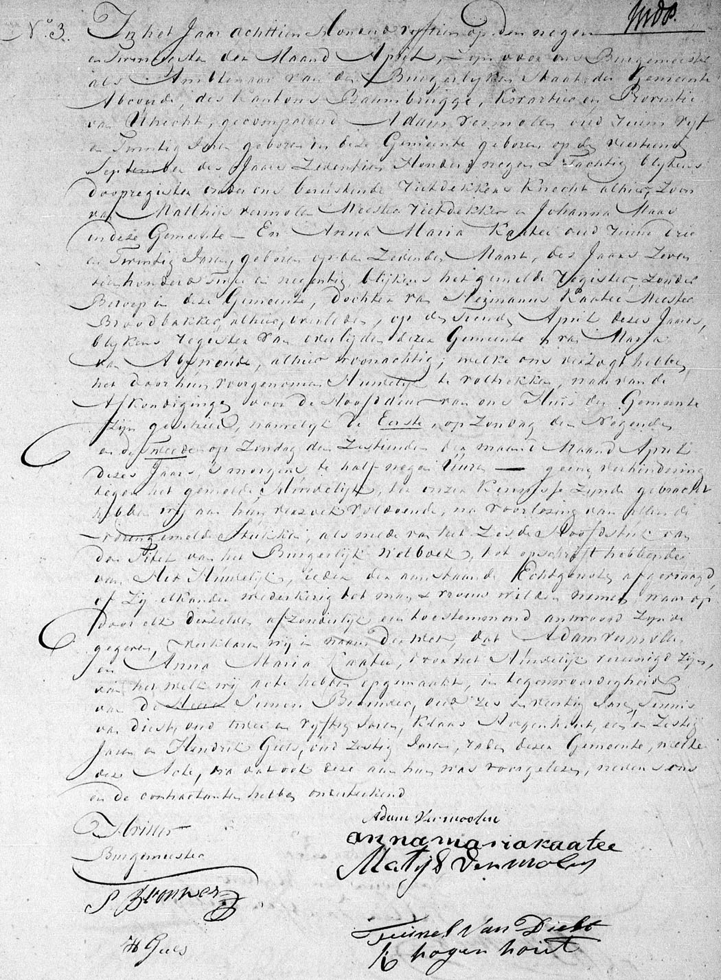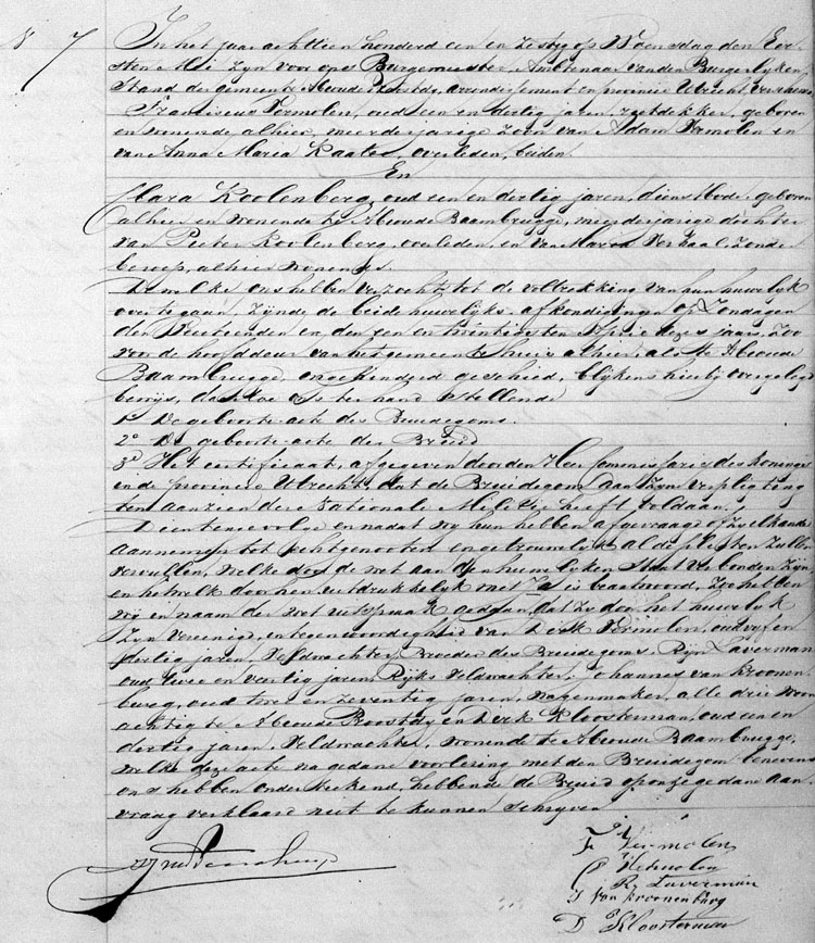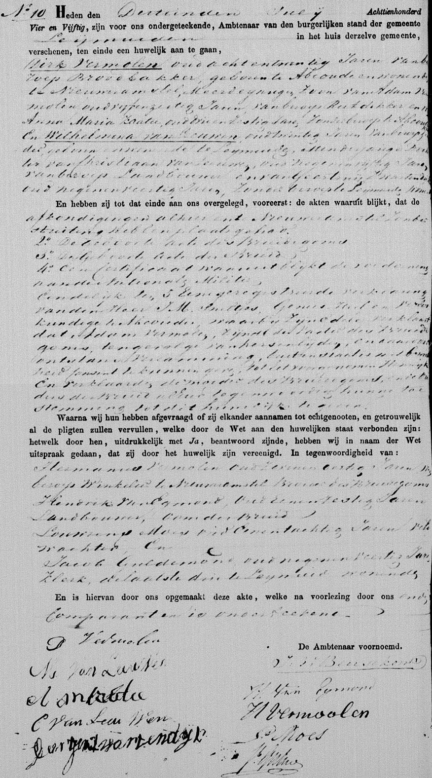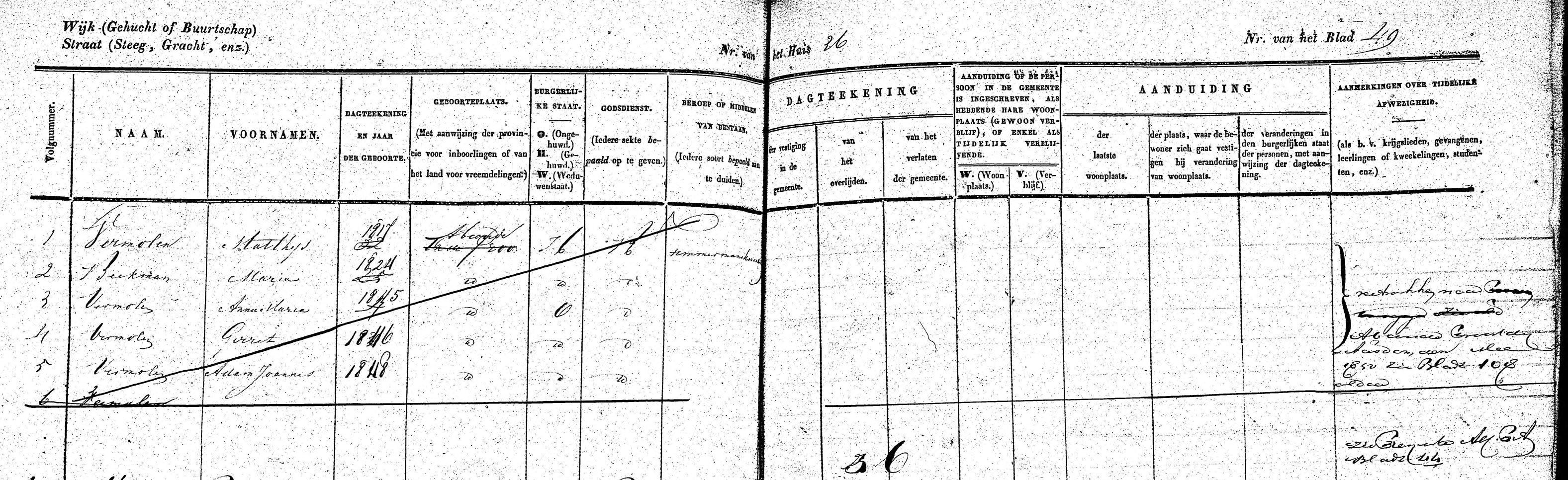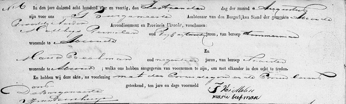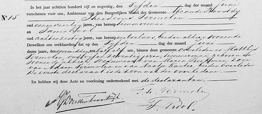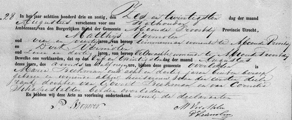 | 2. | m | Matthijs (Matthijs) VERMOOLEN [446], timmerman. Geb. op 27-07-1819 te Abcoude Baambrugge (bron: BS Abcoude Baambrugge). Overl. op 05-06-1895 te Abcoude-Proostdij op 75-jarige leeftijd (bron: BS Abcoude-Proostdij). Otr. [120] op 16-08-1844 te Abcoude-Proostdij (bron: BS Abcoude-Proostdij). Echtgenote is Maria (Maria) BEEKMAN [451], 19 jaar oud. Geb. op 20-10-1824 te Abcoude-Proostdij (bron: BS Abcoude-Proostdij). Overl. op 25-08-1863 te Abcoude-Proostdij op 38-jarige leeftijd (bron: BS Abcoude-Proostdij). Dr. van Johan Gerrit (Johan Gerrit) BEEKMAN [452] en Cornelia (Cornelia) SCHAPENSTALDER [453]. Woonplaatsen na verlaten ouderlijkhuis te _: - Op __-__-18__ Abcoude Baambrugge - 26 (bron: bevolkingsregister Abcoude Baambrugge 1849-1859 inv nr 557) - Op __-__-1850 Abcoude Proostdij - Op 31-12-1889 Abcoude Proostdij - 60, B2 (bron: bevolkingsregister Abcoude Proostdij 1859-1879 inv nr 587) - Op __-__-18__ Abcoude Proostdij - Jaagpad B89 (bron: bevolkingsregister Abcoude Proostdij 1880-1989 inv nr 591 + 1890-1999 inv nr 594) |