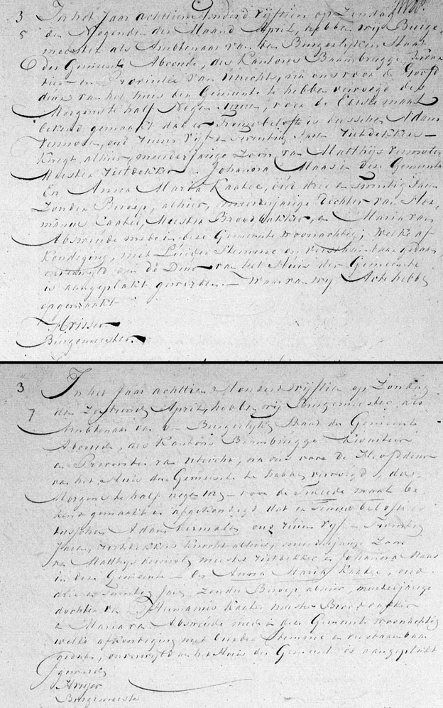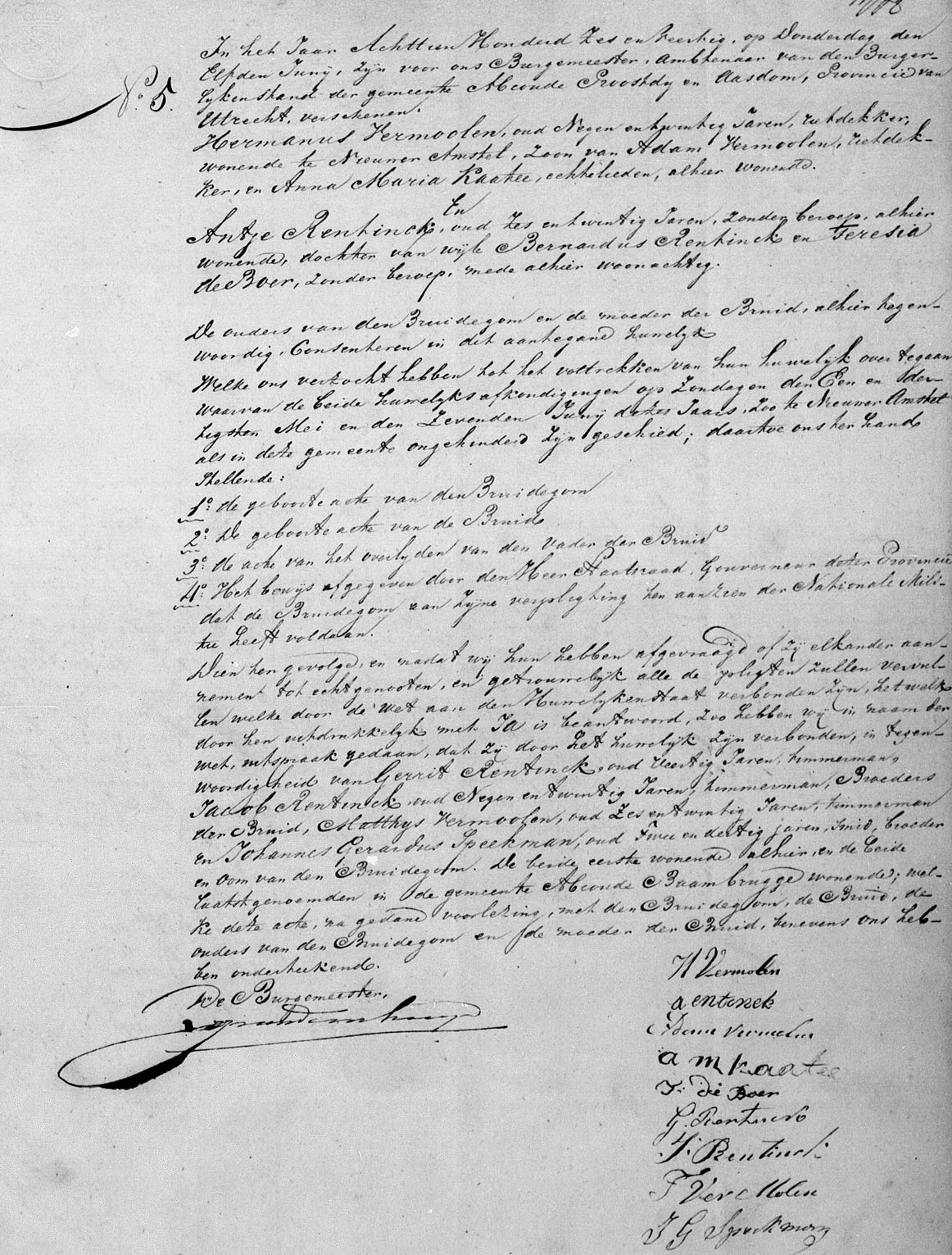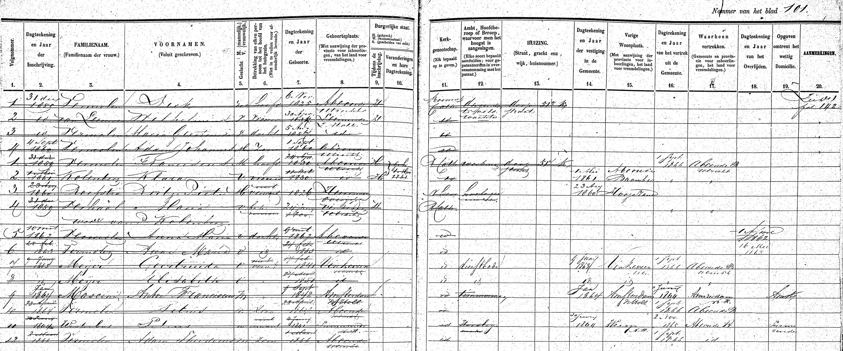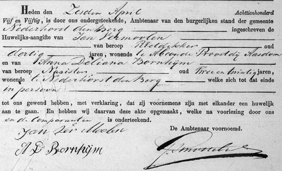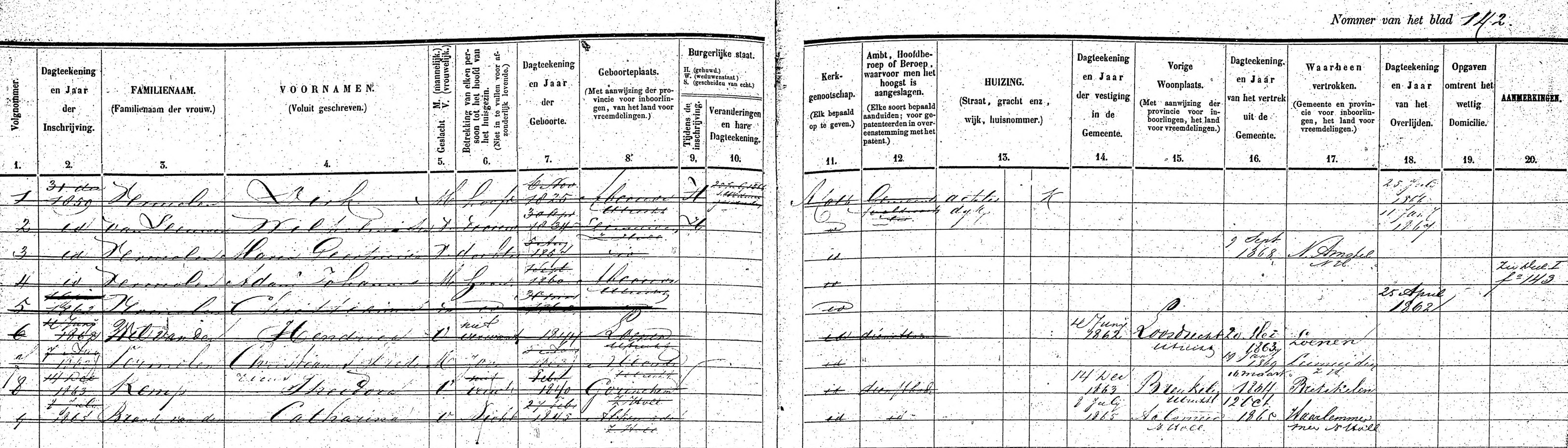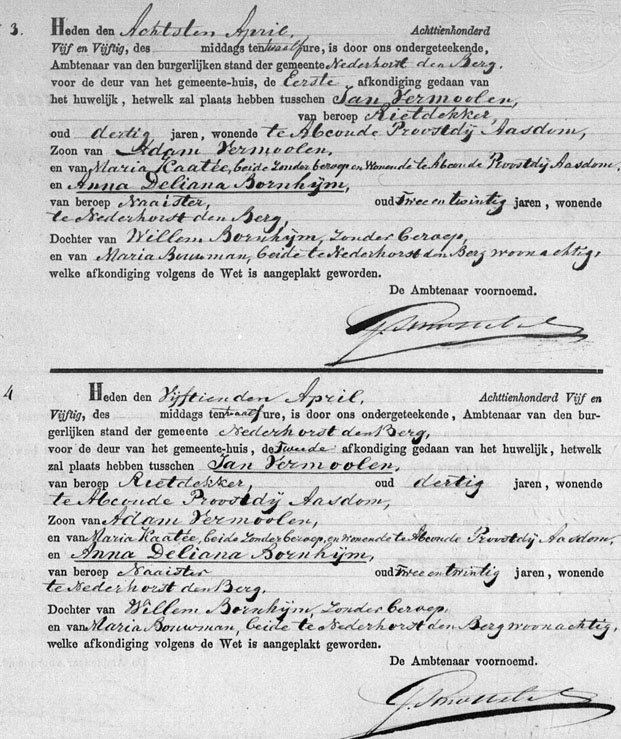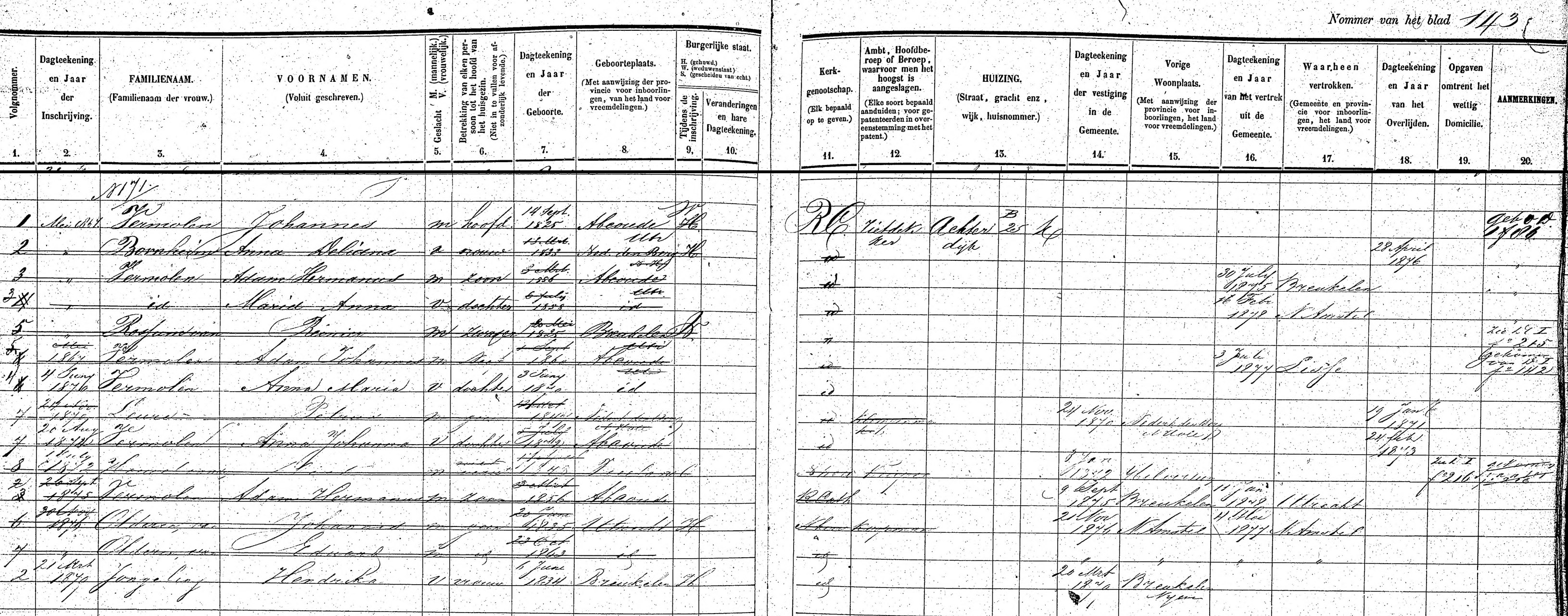 | 5. | m | Johannes (Jan) VERMOOLEN [1018], rietdekker. Geb. op 14-09-1824 te Abcoude-Proostdij (bron: BS Abcoude-Proostdij). Overl. op 19-05-1892 te Abcoude-Proostdij op 67-jarige leeftijd (bron: BS Abcoude-Proostdij). Otr. (1) [336] op 06-04-1855 te Nederhorst den Berg (bron: BS Nederhorst den Berg). Echtgenote is Anna Deliana (Anna Deliana) BORNHEIM (Bernheim) [1026], 22 jaar oud, naaister. Geb. op 13-03-1833 te Nederhorst den Berg (bron: BS Nederhorstdenberg). Overl. op 28-04-1876 te Abcoude-Proostdij op 43-jarige leeftijd (bron: BS Abcoude Proostdij). Dr. van Willem (Willem) BERNHEIM [1028] en Maria (Maria) BOUHUIS [1029]. Woonplaatsen na verlaten ouderlijkhuis te _: - Op __-__-18__ Abcoude Proostdij - 28c (bron: bevolkingsregister Abcoude Proostdij 1849-1859 inv nr 585) - Op 31-12-1859 Abcoude Proostdij - Kerkbuurt 42 (bron: bevolkingsregister Abcoude Proostdij 1859-1879 inv nr 587) - Op 31-12-1859 Abcoude Proostdij - (bron: bevolkingsregister Abcoude Proostdij 1859-1879 inv nr 587) - Op __-05-1867 Abcoude Proostdij - Achterdijk 25b (bron: bevolkingsregister Abcoude Proostdij 1859-1879 inv nr 587) Otr. (2) [335] op 31-01-1879 te Breukelen Nijenrode (bron: BS Breukelen Nijenrode). Echtgenote is Hendrika (Hendrika) JONGELING [1019], 44 jaar oud. Geb. op 21-06-1834 te Breukelen Nijenrode (bron: BS Breukelen Nijenrode). Overl. op 13-02-1907 te Abcoude-Proostdij op 72-jarige leeftijd (bron: BS Abcoude-Proostdij). Dr. van Adrianus (Adrianus) JONGELING [1020] en Magdalena (Magdalena) van SCHAIK [1025]. Woonplaatsen na hun huwelijk: - Op 21-03-1879 Abcoude Proostdij - Achterdijk B25, B28, B40, (bron: bevolkingsregister Abcoude Proostdij 1859-1879 inv nr 587 + 1890-1899 inv nr 591 + 1890-1899 inv nr 594) |