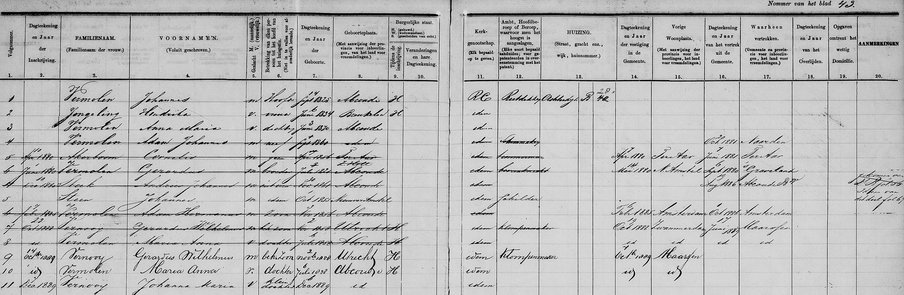 | 11. | m | Petrus (Petrus) VERMOOLEN (Vermolen) [420] (code: 2^05+12), geb. op 08-01-1837 te Abcoude-Proostdij (zie 44). |